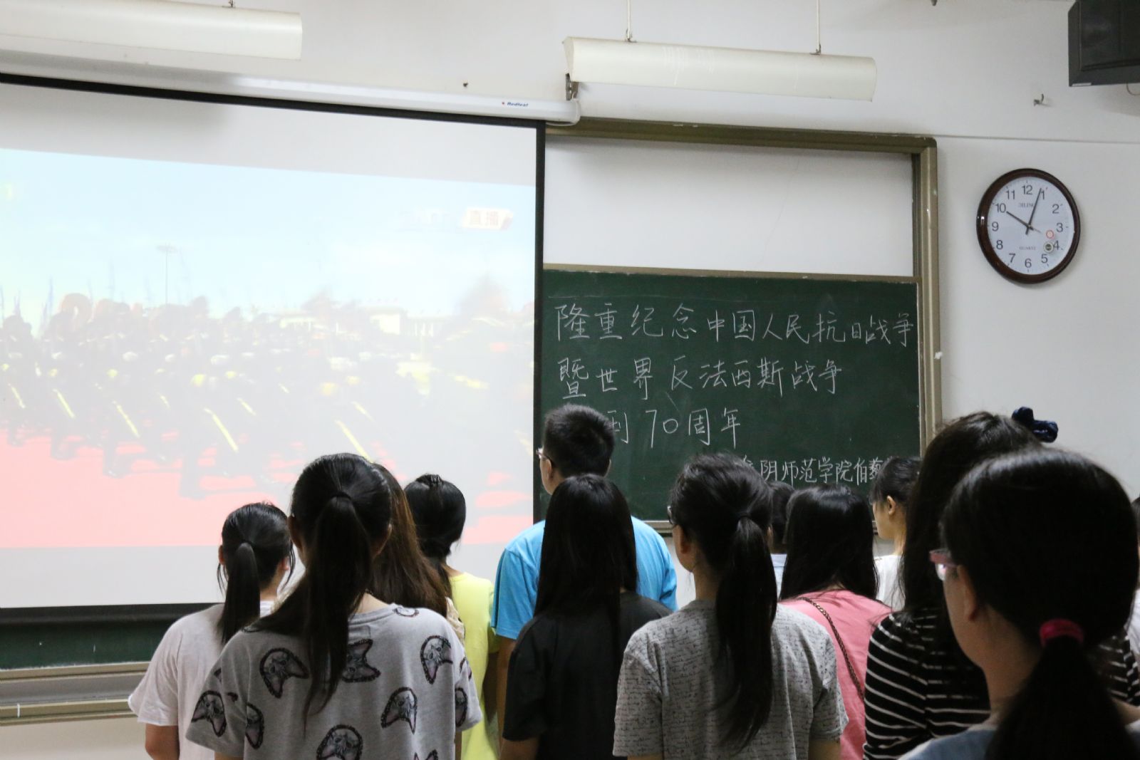 9月3日上午,中国人民抗日战争暨世界反法西斯战争胜利70周年纪念大会和阅兵仪式在北京天安门广场隆重举行,这是新中国成立以来首次以纪念抗战胜利为主题组织的阅兵盛典。为铭记历史、缅怀先烈、珍爱和平、开创未来,淮阴师范学院百余名陶学子于王营校区A1—105教室、A1—107教室观看了阅兵仪式。