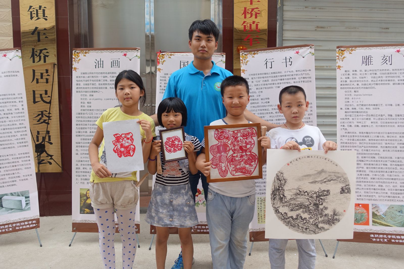 师生们围绕书法、绘画、手工艺品三大板块制作了精美展板并带来了60余幅作品,向孩子们讲述有关艺术的那些事。淮师陶学子们分别从书法、国画、油画、素描、雕刻、印章的历史背景、工具材料、风格特色、应用技法等多方面入手,变枯燥的学习为有趣的“游戏”,提升儿童发现美、欣赏美、创造美的能力。此外,大学生志愿者们发挥自身专业优势,用书法艺术和孩子们一起写下“学海无涯”、“学以致用”等作品,用绘画的方式描绘一幅幅多姿多彩的画卷,用速写的手法记录孩子们青春瞬间,用剪纸艺术剪出心中的彩色梦想……所创作的艺术作品均无偿赠送给当地的孩子们。志愿者们还为他们精心挑选了方格本、算术本、图画本等文体学习用品,将一份份浓浓的爱心真实表达,为关爱留守儿童献上自己的一份力量。