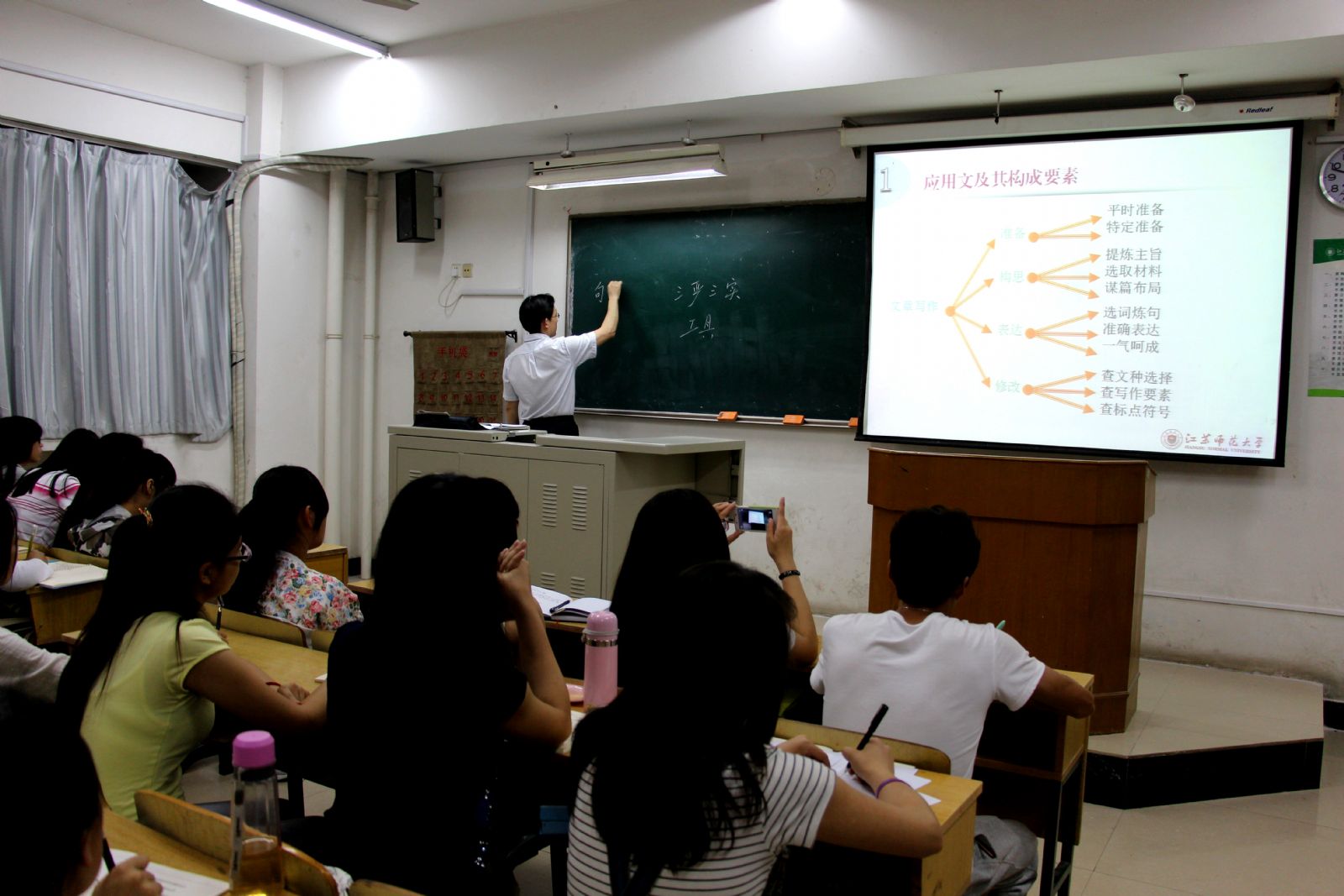 首先,沈老师为大家讲述了应用文的构成,他以我校《江苏师范大学校报》为例,具体讲述了几种不同应用文的构成,为了让大家更容易理解应用文的构成,沈老师把一篇文章比作一个人,其中文章的主旨就好比一个人的灵魂,材料就好似一个人的血肉,语言就像个一个人的细胞,而结构就是一个人的骨髓,这种比喻的讲解方法让陶学子更容易把握应用文整体写作的注意事项和要求。