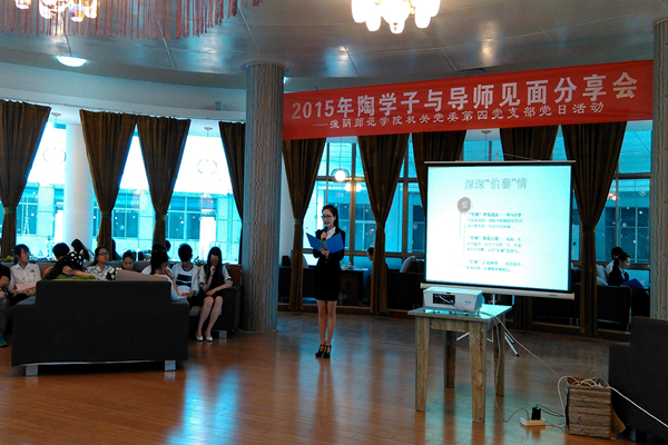 10名优秀陶学子代表借助精美的PPT分享了他们加入伯藜学社以来的收获和体会。伯藜学社常务副社长、城环学院陶学子王前从社团建设、活动开成、成绩荣誉、展望未来等方面进行分享。江苏陶欣伯助学基金会2014年“励志之星”、物电学院陶学子韦巍以《陶欣伯先生赞》中的一句诗“伯藜旨归,贫而志遐”为主题作了精彩演讲,他说:“我是一名平凡而又光荣的陶学子,平凡的是我自己,光荣的是陶学子这个称号。”文学院陶学子王婧分享了入选江苏陶欣伯基金会“2015年新加坡海外创业训练营”项目的经历和体会。2015年江苏陶欣伯助学基金会“励学之星”、美术学院陶学子卓玲感言:“我坚信一句话:坚持到无能为力,拼搏到感动自己,曾经的你在远方,更好的你在路上。” 国家奖学金获得者、城环学院陶学子董卫卫跟大家分享了学习经验,她说:“行动的过程中你才会发现自己有多优秀。”生科院陶学子朱泗莹同学加入的2014年暑期社会实践团队获得了江苏陶欣伯助学基金会6000元资金支持,她说:“社会责任感是从社会实践而来,只有不怕麻烦,不断的尝试,不断的积累经验才能为成功奠定基础。”音乐学院陶学子吕茜茜作为优秀的社团组织者,曾经参加江苏陶欣伯助学基金会组织的社团领导力培训,她说:“只有播种才能有所收获,敢于去做,在克服困难中获得成长。”政管学院陶学子秦佳元深情朗读了《给陶爷爷的一封信》,表达了陶学子们对陶欣伯爷爷的感恩之情。物电学院陶学子朱非非代表14级陶学子分享了加入伯藜学社以来的感悟。