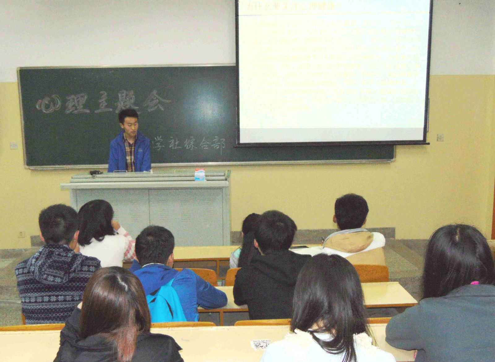 4月18日,综合部率先开展了会议,副部长张海跟就当代社会大力关注心理健康的原因和判断心理健康的标准做了详细的介绍,随后利用新闻案例从生活适应,学习动力,恋爱心理,性格脾气和情绪波动等大学生常有的心理问题,进行了产生原因和解决办法的细致分析,最后会议以一个幽默的心理小测试圆满结束。
