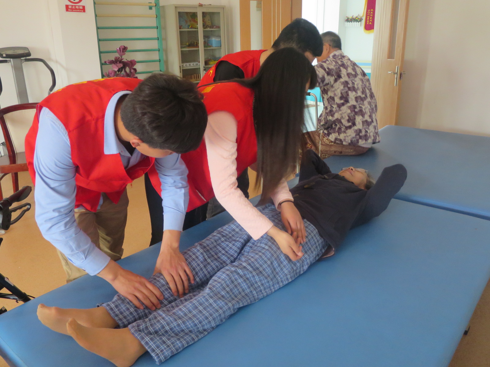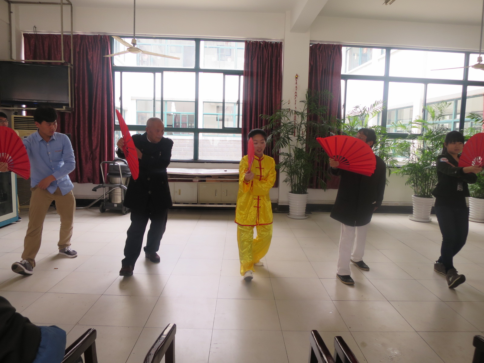 待老人们就坐后,陶学子们此次文艺表演也就开始了。首先是舞蹈《玉生烟》,五个女孩将女生的柔美完全的展现出来,姑娘们的舞蹈获得了老人和工作人员的一致好评。第二个节目也毫不逊色,是由王婷婷学姐带来的音乐照顾,旨在锻炼老人的身体机能,活络筋骨。节目开始前,陶学子给老人分发了活动器材,老人们对活动器材都产生了浓浓的兴趣。紧接着,舞蹈《燃烧吧蔬菜》也让老人情不自禁的跟着打起了拍子。为了迎合老人们的胃口,陶学子们精心准备了大合唱,歌曲是老人们熟悉的《打靶归来》和《没有共产党就没有新中国》这两首红歌。老人们情不自禁的跟着音乐与陶学子们一同唱起来,这个画面仿佛是大家在帮着老人们找回属于他们那个年代的记忆。最后一个节目是大三陶学子王婷婷学姐带来的功夫扇,王婷婷学姐的功夫扇打的有板有眼,两位老人当场更是与她学习了起来。