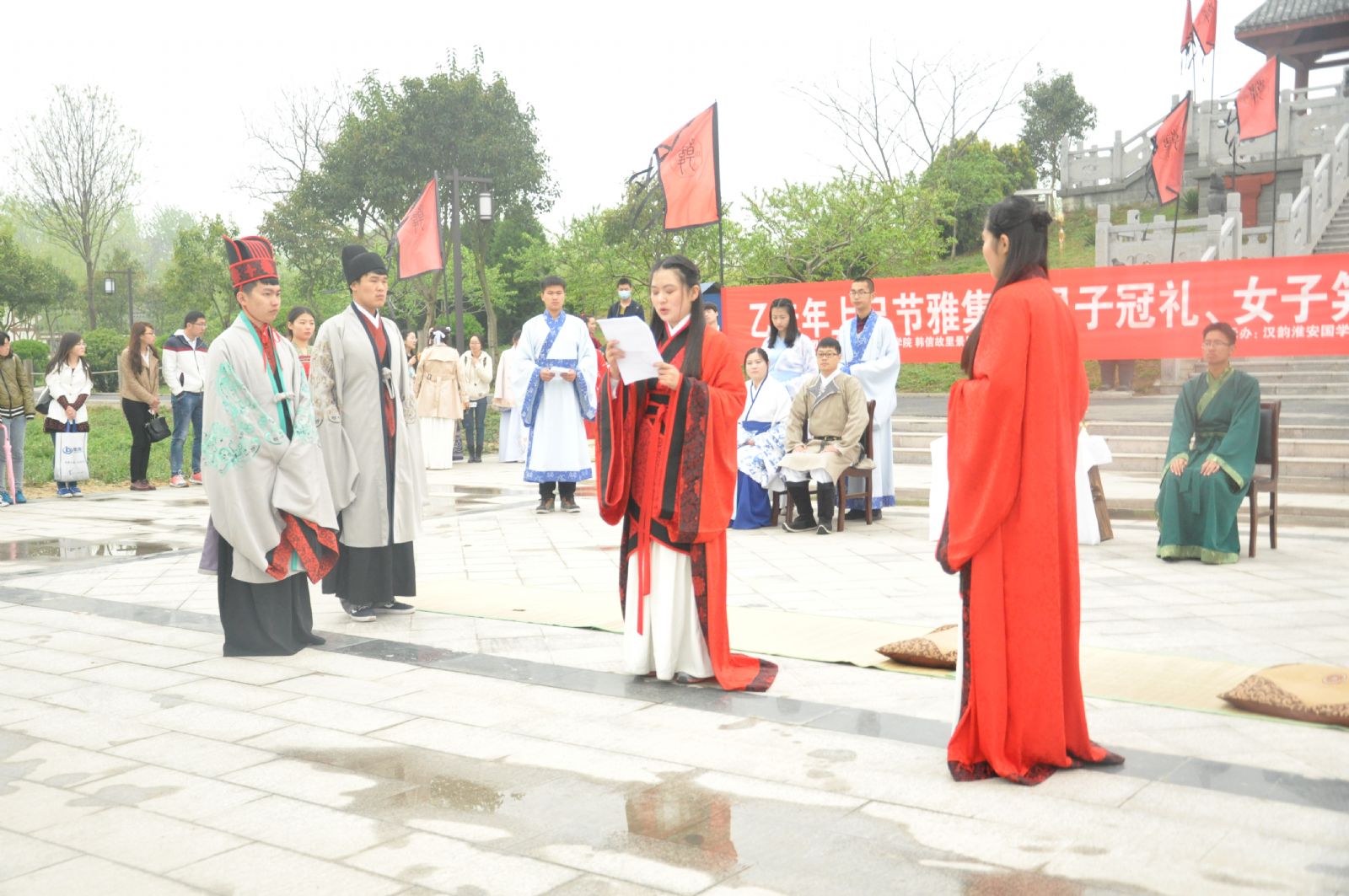 城环学院全体陶学子和微尘志愿服务社代表在韩信故里景区入口排列成整齐的队形,做好了仪式开始前的准备。首先由主持人陈梦竹向大家简单介绍了韩信的事迹和此次活动的流程,接着王涛向大家介绍了此次揭牌仪式的意义,然后,在隆隆的鞭炮声中,揭牌仪式正式开始,最后,所有人员集中到景区的点将台前,观看成人礼表演。