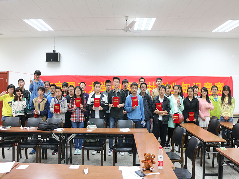 于晚上9点许,活动结束,大家高兴地站在“南理伯藜学社创业知识竞赛”的横幅下,留下了灿烂的笑容。
