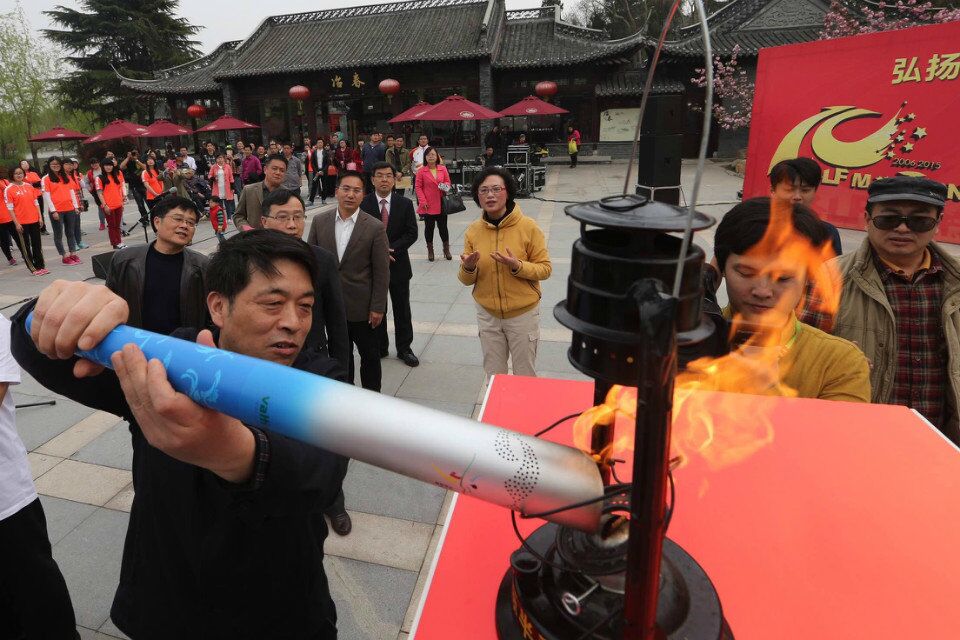 主持人的话刚刚说完,站在队伍中间的陶学子们都翘首往右边大明寺方向看去,原来,是志愿者代表举着火炬往志愿者们所在地飞快地跑过来了,熊熊焰火吸引着志愿者们的目光,掌声也更加雷动。接着,扬州市副市长孔令俊先生双手接过火炬将火种引接到圣火灯中,“此次扬马将更加走进生活,接近市民!”孔令俊先生说完这句话,就把圣火灯传递给了扬州生活用品有限公司总经理。