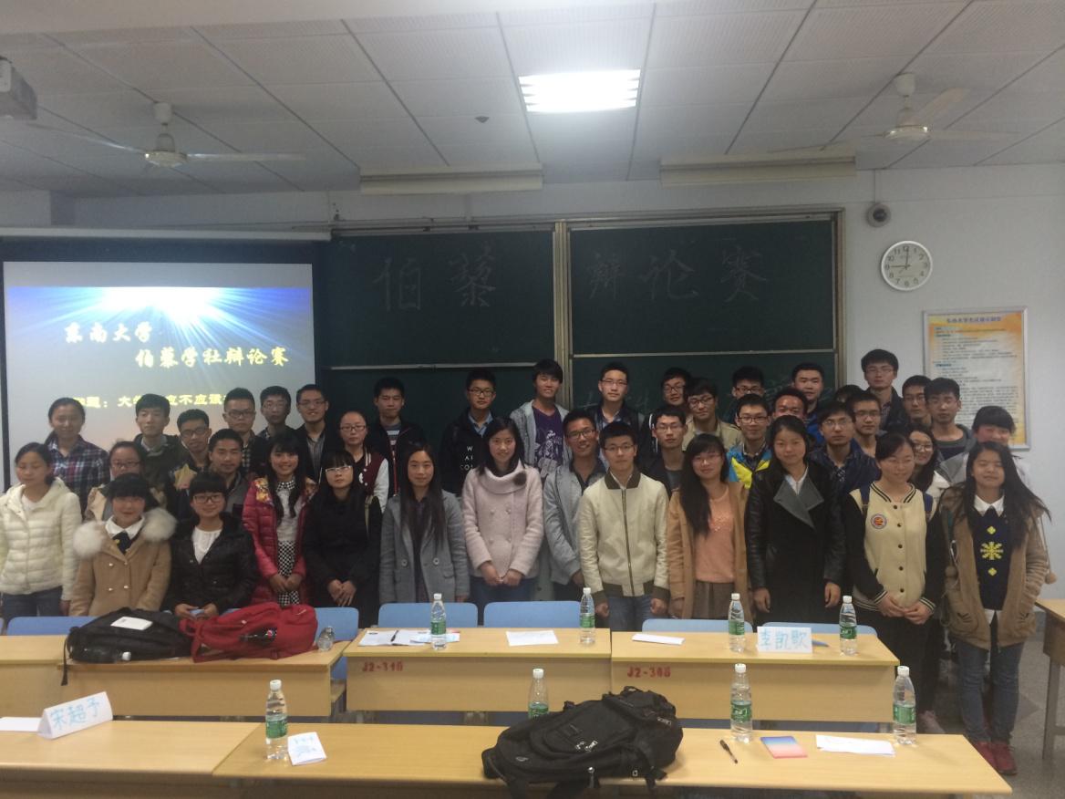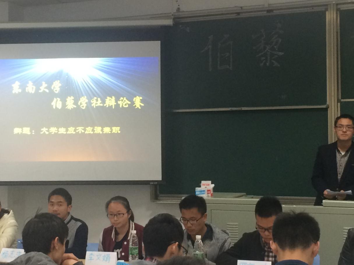 4月11号,东南大学伯藜学社举办的“伯藜书话——唇枪舌辩,我辩故我在”辩论赛在教学楼2-306举行。伯藜学社指导老师白洁以及43名陶学子参加了本次活动。辩论赛由陶学子代表主持。