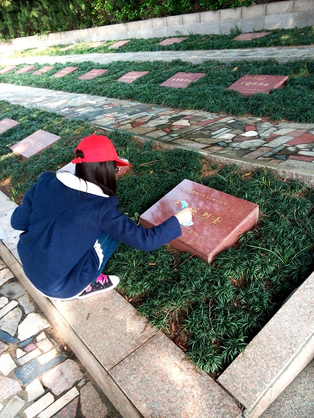 得到陵园工作人员的大力支持后,负责人迅速确定好分组分工,活动细化为三个环节进行。首先是悼念先烈。陶学子们将手制花朵献于英雄陵前后,并在墓碑前集体默哀三分钟以表达内心对先烈英雄们的钦佩和尊敬。接着是擦拭墓碑,清洁墓碑前已枯萎的花朵、杂物,并用抹布认真地擦拭墓碑上的泥土,直到墓碑表面干净清晰。最后环节是清除花园草坪内的碎石子和垃圾……