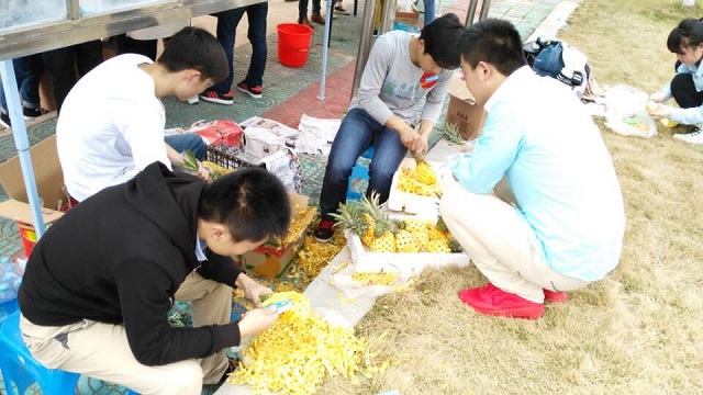 为了更加充分的迎接此次大赛,创业部的陶学子们在午饭过后便开始忙碌起来,他们在西苑食堂门口摆好桌子,支好帐篷,放起音乐,准备和包装好销售的水果,一切进行的井然有序。活动期间,现场围满了一大片感兴趣的同学,很快,水果被“顾客”一扫而光。幕后参与削菠萝的同学们忙得不可开交,见此情形,其他在场的陶学子立即参与,纷纷动起手来,现场气氛十分热闹。活动一直持续到下午19:00,一下午“激战”过后,大家收拾好现场,结束了这一精彩的营销大赛,画上了一个圆满地句号。