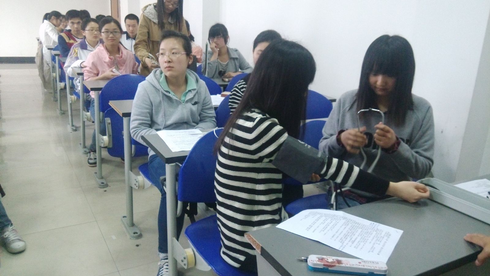 培训准时开始,整个培训活动由志愿中心的部长缪婷婷主持。在同学们落座以后,首先发给同学们她事先打印好的培训资料,可以明显的看到那份资料上有她很用心勾画出的重点以及各种注意事项,接下来她便开始带领着大家看这份资料,首先说的是量血压。在说理论知识的同时她也找来小伙伴跟她搭档,演示给大家看,大家都听得很认真,时不时还问一些问题,气氛非常好。在缪部长的演示过后大家都跃跃欲试,于是接下来便让大家自己动手练习。大家拉着各自的小伙伴为其量血压。平放胳膊、排空气囊、调好开关、将气囊裹到胳膊上、一次次地打气、慢慢地松开阀门……能看出量血压的人有一些紧张,但是依然很想尝试,努力有条不紊地做好每一步,学长学姐也在一旁为同学们示范解惑。