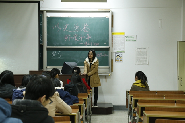 活动初始,魏思敏同学就用隽秀的字体写下“以史为鉴,珍爱和平”。清明将至,许多个人与团体开展了各种活动,悼念亲人,悼念朋友。其中也有很多四面八方的人纷纷来到南京大屠杀纪念馆,送花扫墓寄哀思,遥望为民族大义洒热血献生命的忠魂义士。魏思敏同学在活动过程中引用了张纯如的一句话“忘记南京大屠杀,等于是遭受第二场屠杀。”青年学生绝不能忘记南京大屠杀。