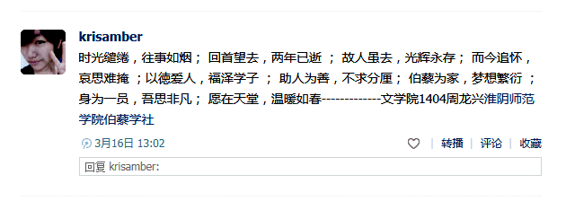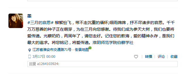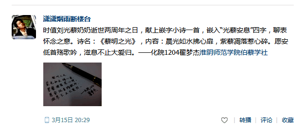 为纪念敬爱的刘光藜奶奶,淮阴师范学院伯藜学社在3月15—3月19日开展了微博征集活动。截至19日晚上九点,共有135名陶学子参与此次活动。