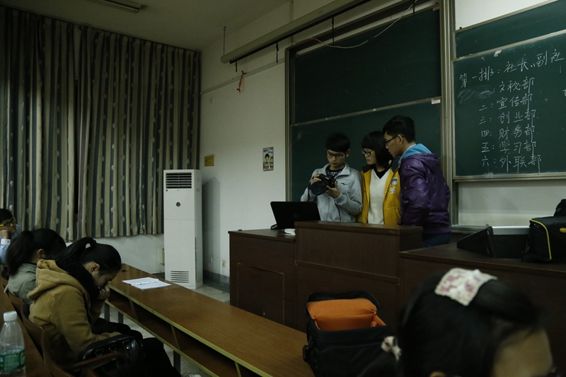 交流会最后,朱猛飞给同学们拿出了借来的四款相机,为同学们现场实践提供机会,感兴趣的同学们都纷纷上前拿起相机拍摄、讨论起来。“‘现学现卖’,虽然同学们学到的东西一时消化不了,但通过操作对单反有了进一步的了解,以后再拿到相机就不会再陌生了。”朱猛飞说,“‘吸毒毁一生,单反穷三代’,由于单反相机以及其配件价格很高、可玩性很强等特点,并不建议陶学子们现在沉迷摄影,但是我还是希望通过这样的交流会拓宽同学们的知识面,毕竟现在相机已很常见,同学们虽然自己没有相机,但基本的操作还是要了解一下的。”