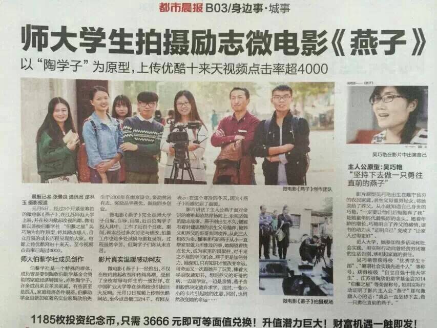 元月5日,经过3个月紧张筹拍的微电影《燕子》,在江苏师范大学上映,并在校内掀起收视热潮。微电影以该校伯藜学社“伯藜之星”吴巧艳为创作原型,将其励志感人、自立自强的成长历程呈现给大家。电影上传优酷网站十来天,至今视频点击率已超过4000。