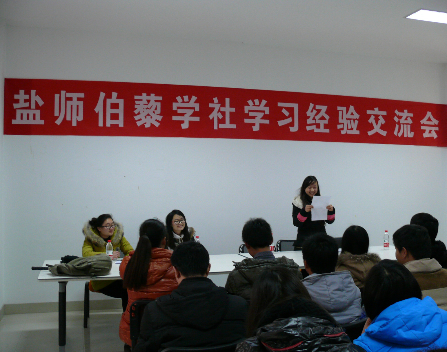 2015年1月7日下午3点,盐城师范学院的陶学子在学工楼四楼会议室召开了伯藜学社学习经验交流会。会议邀请了学生工作处吕贤旺老师和两位学姐参加,由学习部部长师影主持本次会议。