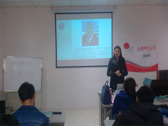 2015年1月4日下午,南师伯藜学社在仙林校区笃学楼招聘大厅进行了14级新生入社的第一次全体大会,出席人员有伯藜学社社委成员以及12、13、14年级的其他社员,会议由社长冯丹主持。