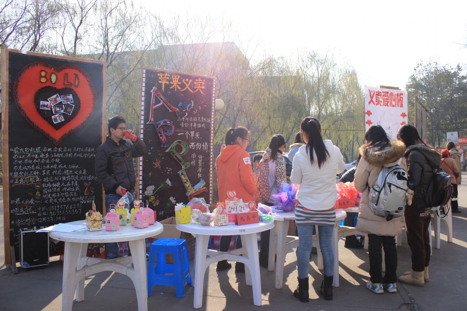 “你是我的小丫小苹果,怎么爱你都不嫌多”,激昂动感的音乐从义卖的各个摊点飘出,飘扬在南京林业大学的各个角落,加上圣诞老人亲切的笑容、搞笑滑稽的动作,义卖现场一片欢腾。