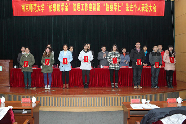 12月29日下午,2014年度“伯藜助学金”管理工作座谈暨“伯藜学社”先进个人表彰大会在仙林校区顺利举行。江苏陶欣伯助学基金会秘书长张利伟、基金会行政总监刘萍、基金会助学项目主管张月红、基金会项目主管江君及我校党委副书记王建出席了本次会议。表彰大会由学生工作处副处长李前进主持。