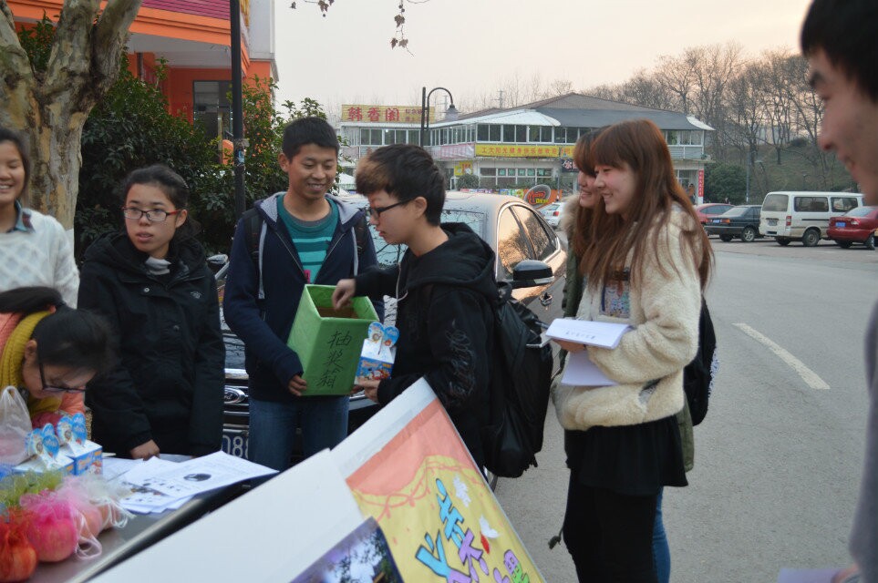 23日下午4:00,义卖在象山、南苑和东苑正式拉开帷幕。当我们的宣传海报贴出来时,现场就吸引来不少同学,现场的陶学子热情的向大家介绍义卖活动的具体情况,以期得到更多的同学关注和购买。刚开始,各个摊点还是稍显冷清的,但大家还是耐心的介绍宣传。晚饭期间,当大量的人开始涌入食堂的时候,义卖现场马上变了模样,购买的同学一个接一个,活动现场好不热闹。东苑食堂前的摊点更是吸引来了班级班委的目光,一下就卖出出三十个平安果,同时在现场购买的人还幸运的抽走了一二等奖,引得现场的人直喊“好手气”。夜幕降临,随着吃饭的人群慢慢散去,义卖现场开始又冷清了。但我们的陶学子为了卖出更多的平安果,筹的更多的善款,大家继续在冷风中坚守,直到晚上8:30。