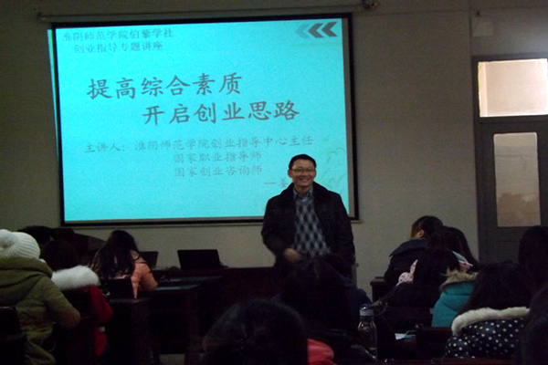 12月20日下午,淮阴师范学院伯藜学社在大学生创业孵化园开展了“提高综合素质 开启创业思路”创业专题讲座。本次讲座由国家创业咨询师、国家就业指导师、淮阴师范学院创业指导中心主任姜强强老师主讲,百余名陶学子参加了本次讲座。