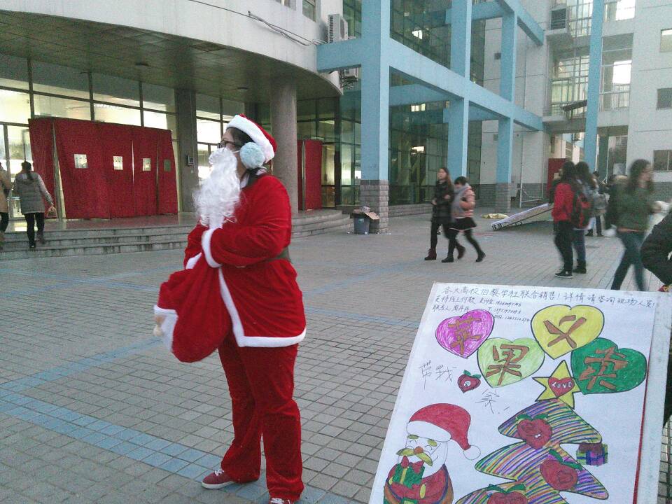 义卖现场,圣诞老人装扮的分外可爱,引来众多学生与其拍照。现场氛围随着关注的人不断增多也越来越热烈。负责义卖平安果的同学,充分发挥出自己的才能,积极向过往同学介绍现场情况。我们本次平安果的种类主要是橙子、苹果、蛇果,我们用最优惠的价格和最高的质量来为同学服务。本次义卖主要采用线上和线下两种方式,各大高校伯藜学社联合起来参与到苹果义卖活动中来,这样的方式不仅可以增进高校伯藜学社之间的沟通,这种方法也体现出我们的与时俱进的精神。