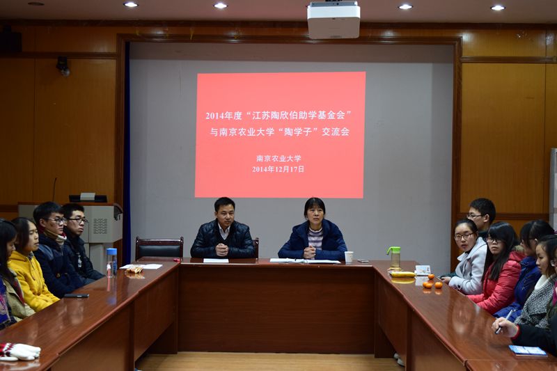 “伯藜师生聚南农,亲密座谈暖人心!”2014年12月17日,江苏陶欣伯助学基金会–南京农业大学2014年度工作交流会先后于南京农业大学行政楼和逸夫楼进行。江苏陶欣伯助学基金会秘书长张利伟先生、基金会项目主管张月红和江君老师,南京农业大学党委副书记盛邦跃教授、学生工作管理中心宫佳老师及包小萍老师等出席本次会议。南京农业大学伯藜学社负责人骆美红、各部门负责人以及部分陶学子参与会议交流和讨论。