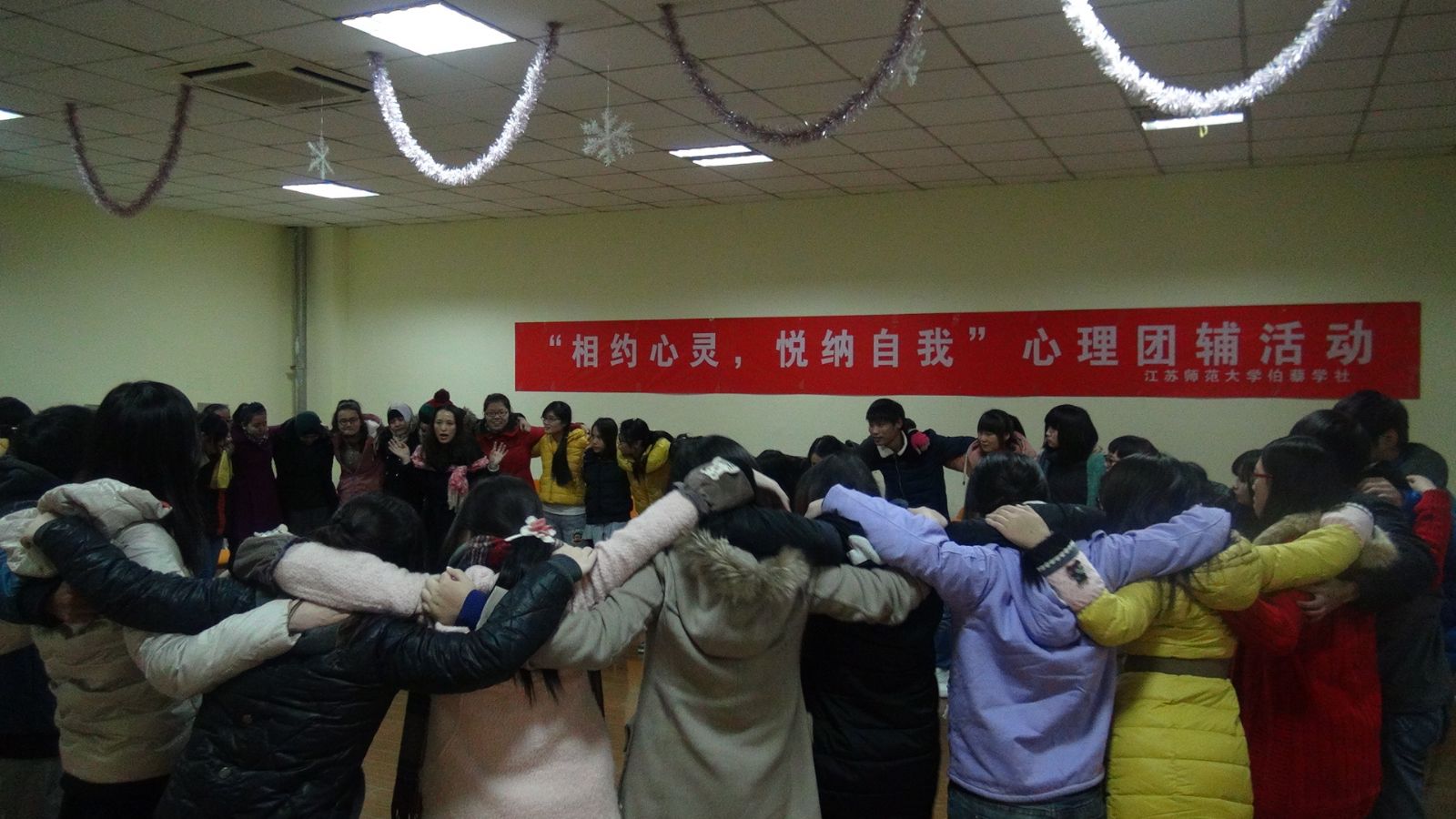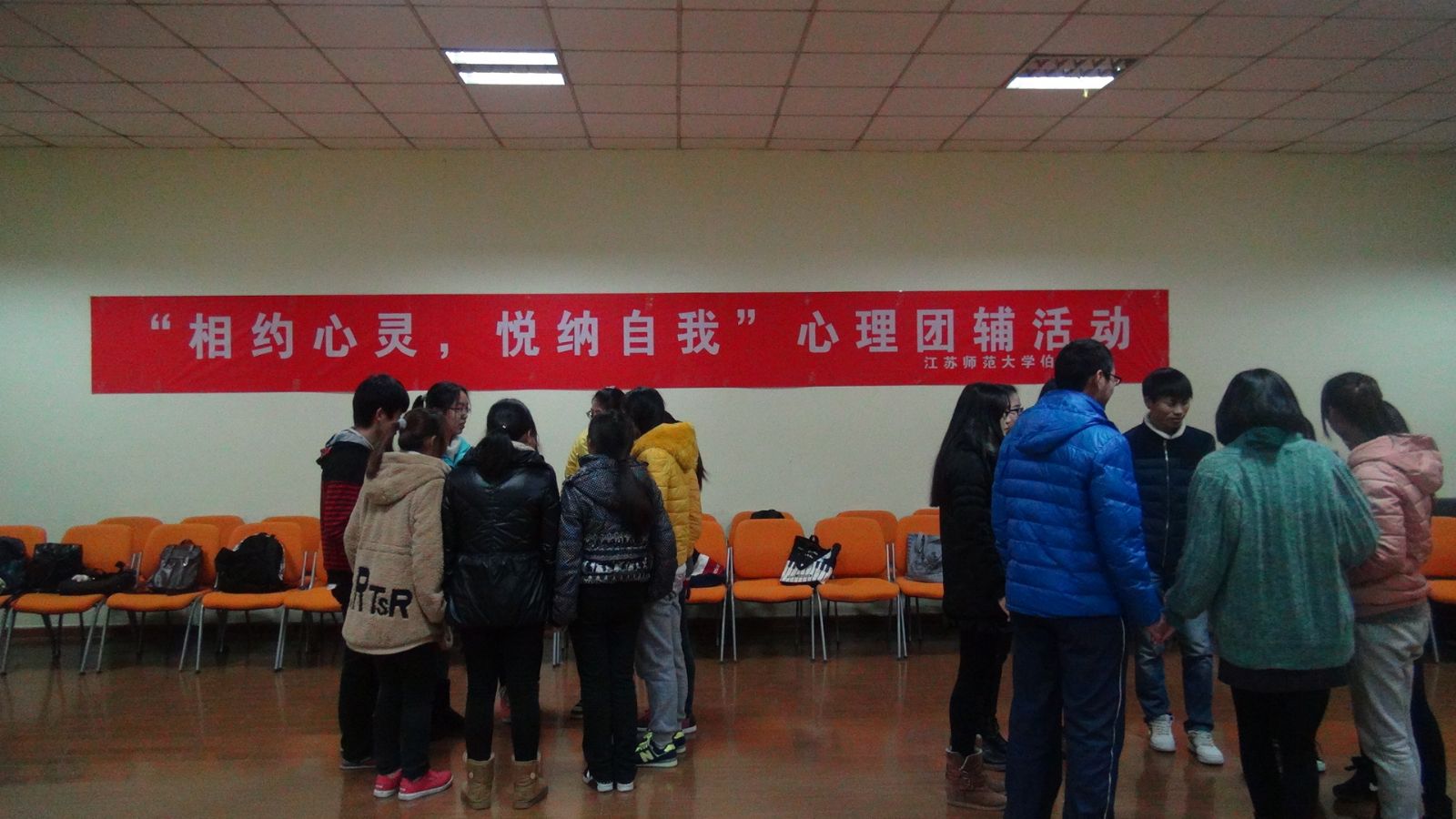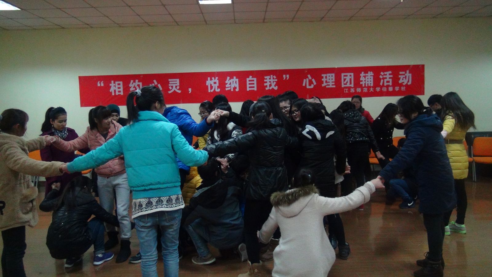 随着社会飞速的发展,社会竞争日益激烈,挑战与压力的并存,梦想与现实的冲突,新时期大学生的心理健康状况不容乐观,心理健康问题已经成为当前大学生具有普遍性的一个问题。家庭经济困难学生是高校相对弱势的群体,易产生焦虑、抑郁和人际交往等心理问题,更需要得到社会的支持和帮助。我校十分重视培养陶学子的心理素质,为了使陶学子能够更为积极地面对学习、生活中的各种困难, 12月3日下午6点,江苏师范大学伯藜学社在泉山校区大学生心理中心举办了以“相约心灵,悦纳自我”为主题的心理团辅活动。陶学子在国家劳动部心理咨询师培训主讲专家、国家二级心理咨询师、我校心理学副教授薛静华的带领下,开展了一次新颖独特的心理团辅活动。