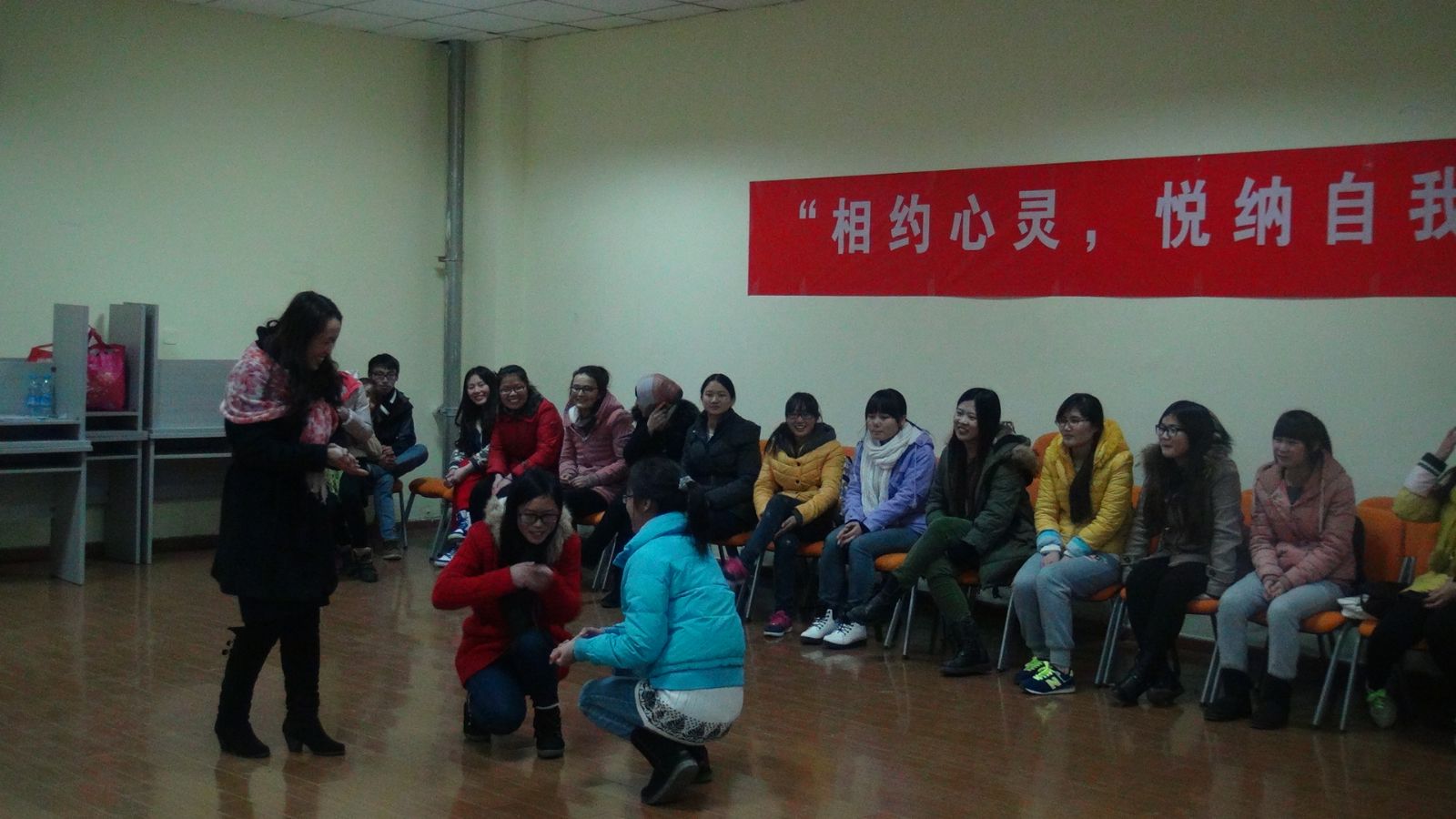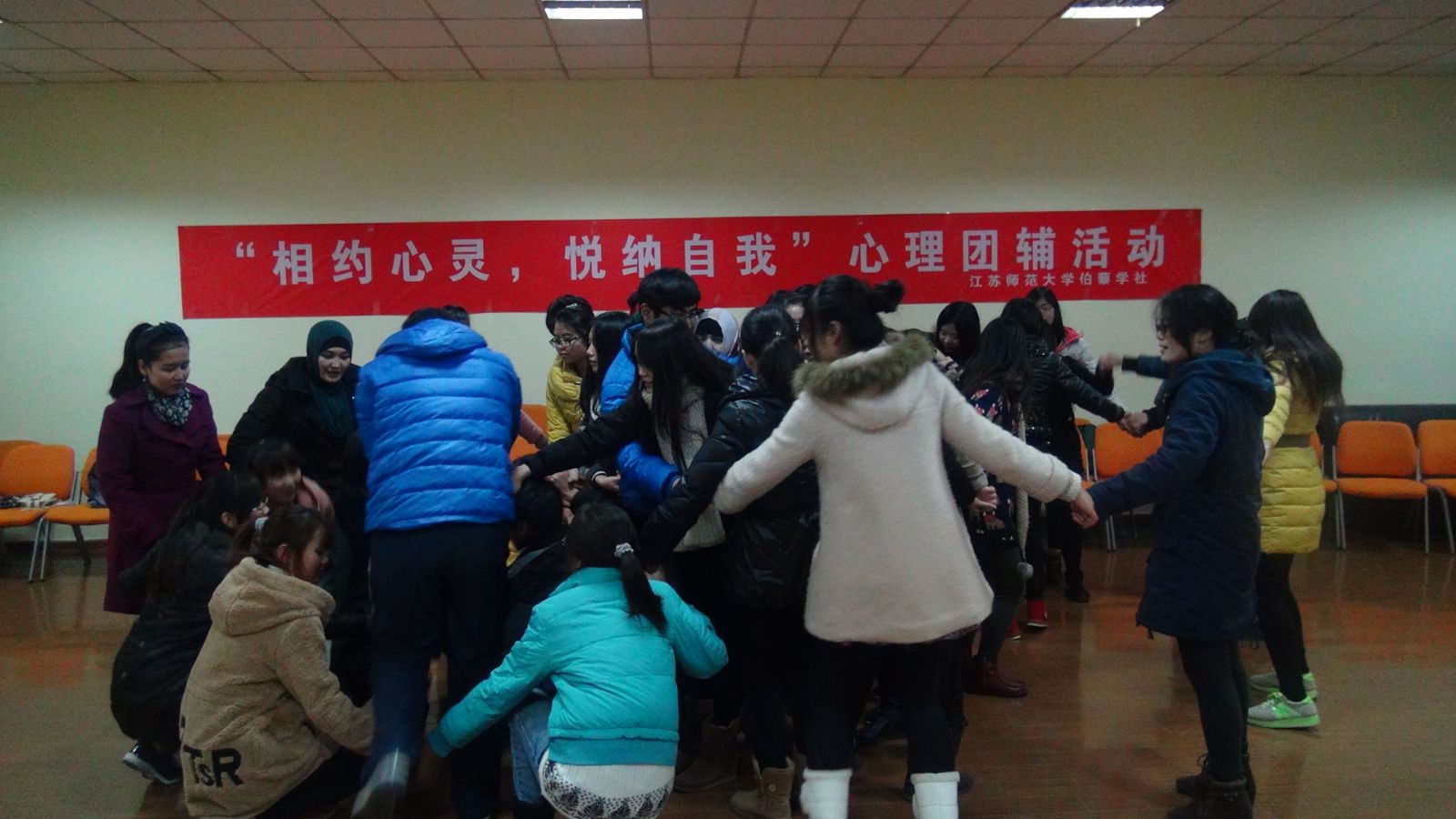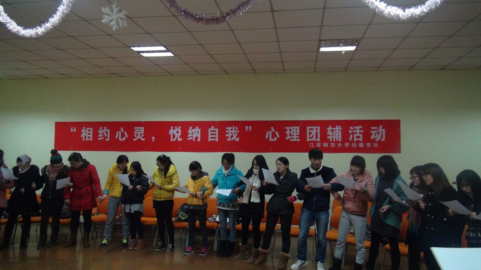 随着社会飞速的发展,社会竞争日益激烈,挑战与压力的并存,梦想与现实的冲突,新时期大学生的心理健康状况不容乐观,心理健康问题已经成为当前大学生具有普遍性的一个问题。家庭经济困难学生是高校相对弱势的群体,易产生焦虑、抑郁和人际交往等心理问题,更需要得到社会的支持和帮助。我校十分重视培养陶学子的心理素质,为了使陶学子能够更为积极地面对学习、生活中的各种困难, 12月3日下午6点,江苏师范大学伯藜学社在泉山校区大学生心理中心举办了以“相约心灵,悦纳自我”为主题的心理团辅活动。陶学子在国家劳动部心理咨询师培训主讲专家、国家二级心理咨询师、我校心理学副教授薛静华的带领下,开展了一次新颖独特的心理团辅活动。