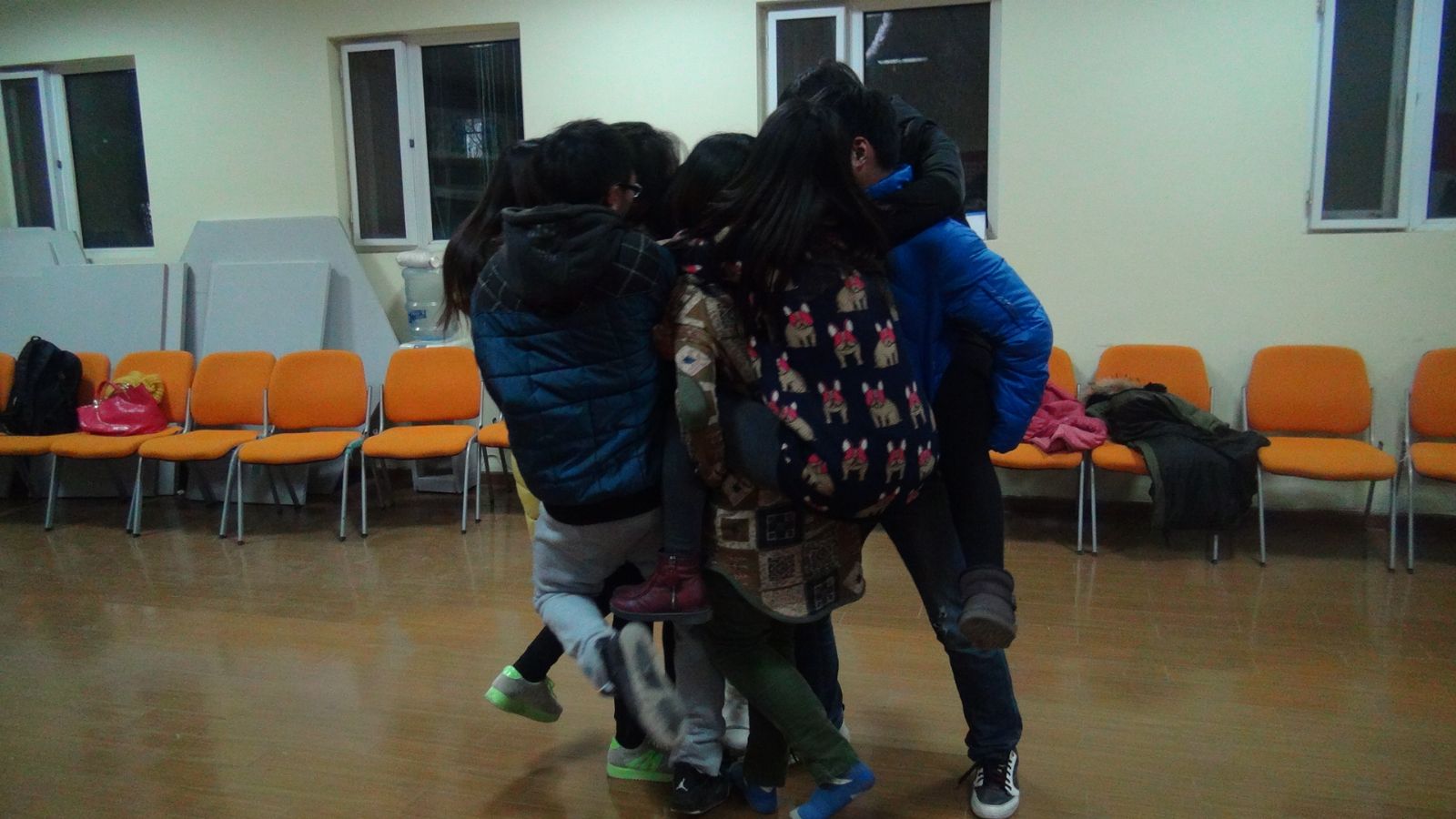 陶学子们手拉着手站成一个大圆圈,大家一起喊:“马兰开花,马兰开花,风吹雨打都不怕,勤劳的人们爱说话。”薛老师口令:“我们六个人是一家!”陶学子根据口令要求的人数组成一个个小圆圈,剩余不足一组的人数就是“无家可归者”,这样分家分了几次之后,终于把家分好了。薛老师要求曾被沦为无家可归的同学谈谈自己的内心感受。在这种天寒地冻的冬天里,“无家可归者”说觉得自己孤单无助,有家者表示自己特别幸福而且很同情“无家可归者”。薛老师说分家使成员们在感受游戏快乐的同时,还能体验到融入集体内的喜悦感和被排斥在外的孤独感。接着每个家庭围成圆圈以滚雪球的方式做自我介绍,每个人介绍自己时都要把前面同学说过的话再重复一遍,雪球滚了两遍之后每个家庭的成员之间就有了最基本的了解。互相熟悉后的每个家庭成员之间还做了对视、问好、同舟共济等小游戏。