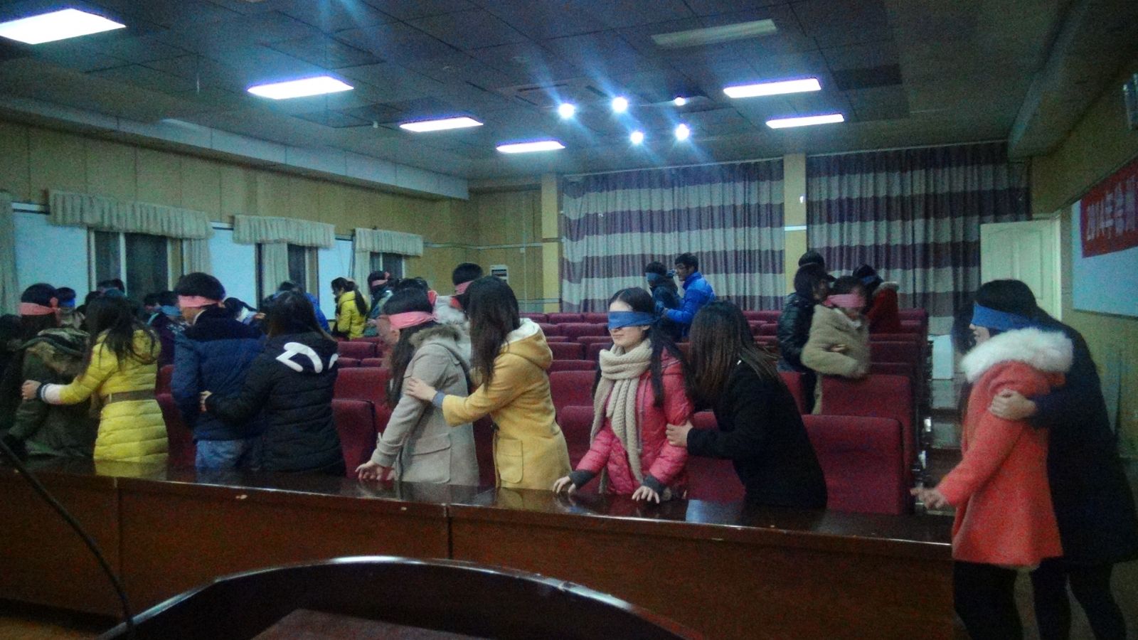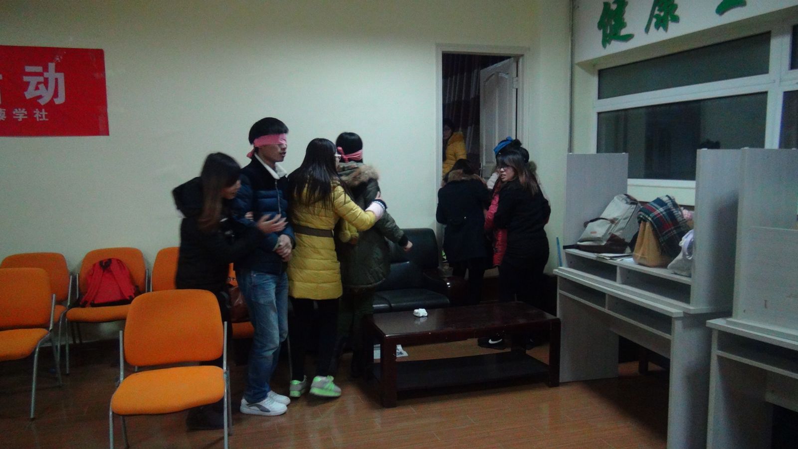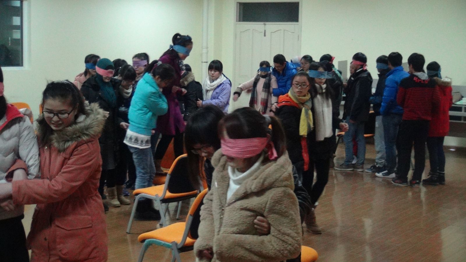 “同学们报数”,“1、2,1、2,1、2……”,数到1的同学站出来,蒙上眼睛充当“盲人”;数到2的同学找一个“盲人”对象,给他当“拐杖”。然后两人一起挑战薛老师设计好的盲行路线,穿越各种障碍物,上下楼梯,跨越,下蹲,最后到达终点。。“盲人”旅行过程中,“拐杖”只能用肢体动作引导,不允许进行语言交流,这条规则让很多“拐杖”在引导“盲人”时话到嘴边又咽回来了。成功到达终点的李玲刚拿开眼罩,就兴奋地说:“终于重见天日啦,我是怎么到这里来的呀!真是太神奇了!”。“蒙上眼睛后仿佛进入了一个陌生的世界,感到孤单害怕,不敢往前走,在黑暗中‘拐杖’牵住了我的手,并且带着我前行,十分感谢我的‘拐杖’陪我走到了终点”代俊深有感触地说。盲行体验增强了团体成员的信任感,活动过程中的互助让同学们感受到了彼此的关心。陶学子们深切地体会到弱势群体的难处,同时对于自己能够拥有健康的身体而感到幸运。