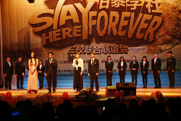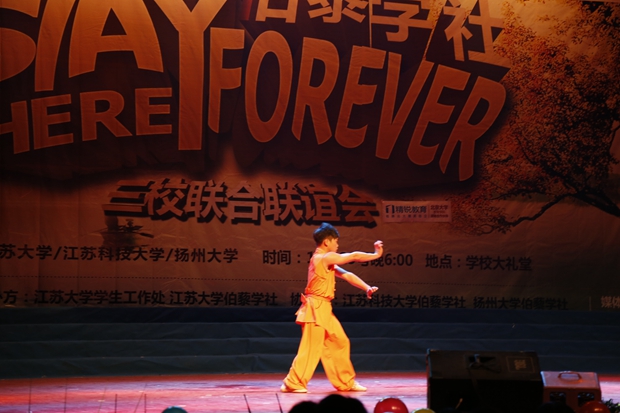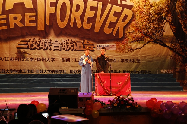 “作为陶学子,我们肩负沉甸甸的嘱托,我们憧憬美好的未来。”11月29日晚,由江苏大学、江苏科技大学和扬州大学伯藜学社联手举办的“Stay here forever”三校联谊活动在江苏大学大礼堂举行。此次活动由江苏大学主办,扬州大学和江苏科技大学协办。扬州大学为此次活动准备了六个节目,其中一个武术表演节目由三校一起负责。