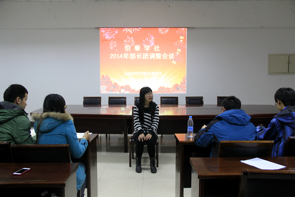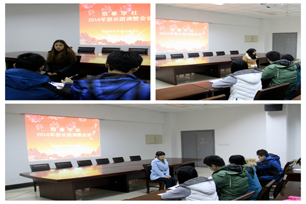 11月25日晚,淮阴师范学院伯藜学社于理工北楼108会议室召开了2014年部长团调整会议。出席本次会议的有伯藜学社指导老师周以杰和伯藜学社社长团。