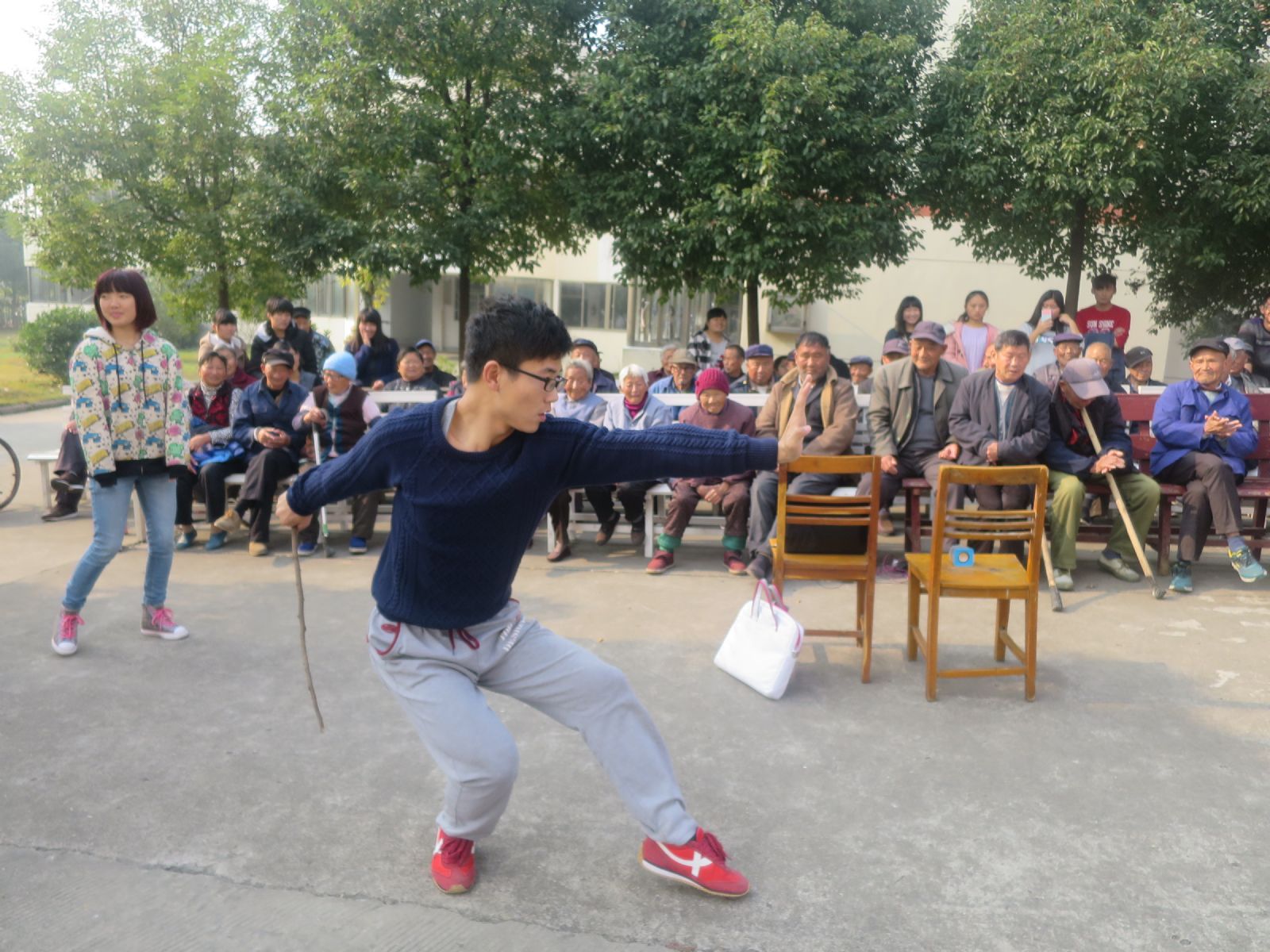 首先由沈娟为老人们带去了三首音乐照顾,帮助老人们活动他们的筋骨,愉悦身心;随着欢快的音乐,老人都很快的进入到我们的活动氛围中来。随后由蔡嘉欣带领陶学子为爷爷奶奶们表演了手语—《感恩的心》,感谢爷爷奶奶们为子女们无私的奉献; 紧接着由戴笑嫣带领陶学子跳了一首小苹果,使演出气氛变得更加热情似火。