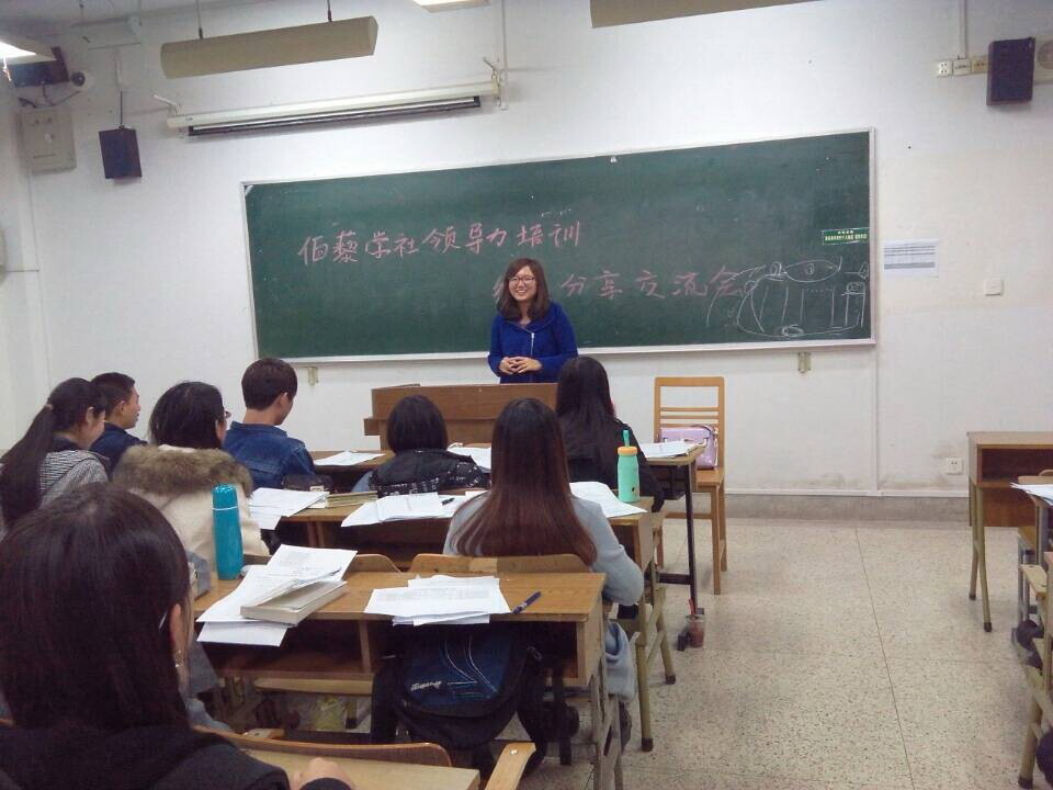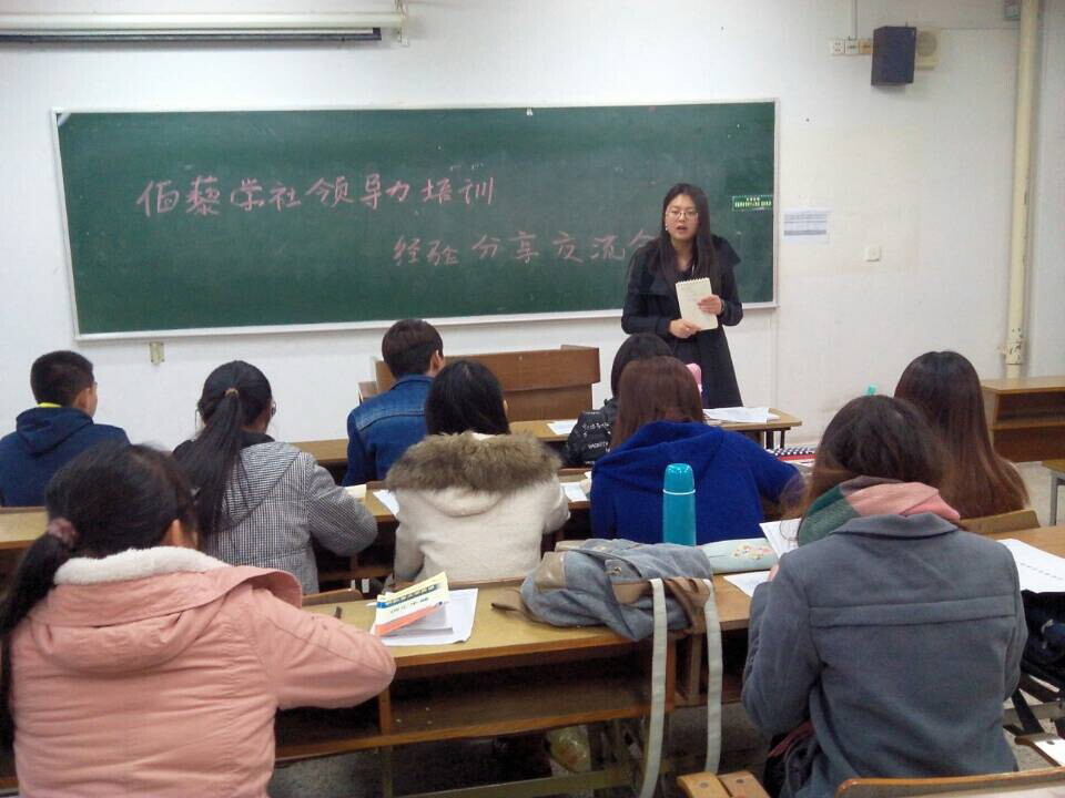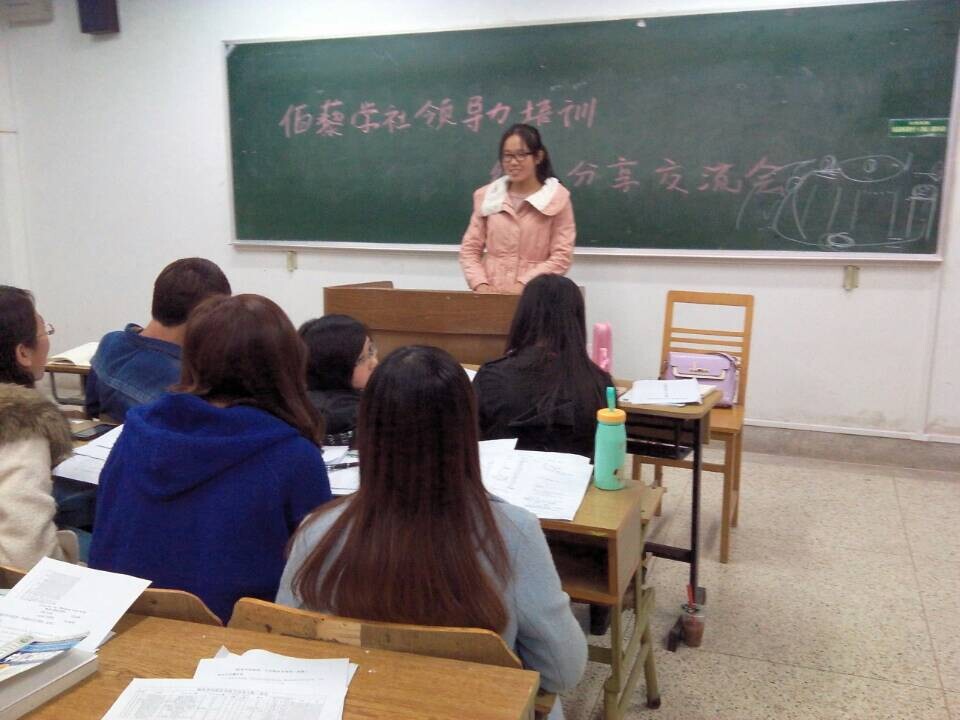 2014年11月19日,南师大伯藜学社在学明楼313举办了江苏陶欣伯助学基金会第三次领导力培训的分享和交流会,社长冯丹与顾珊珊,陈昆分别做了分享。与会人员为三位副社长,以及各部门正副部长。
