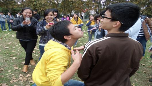 经过了破冰活动后,活动正式开始。首先主持人将男生女生分开集结在一起,然后通过报数的方式将所有陶学子分成九个小组,并在限定的时间内,每组想出自己的队名、口号与队形,最后进行集体展示。接着进入到游戏环节。游戏1是吸管传皮筋,顾名思义,就是用吸管以最快速度传递皮筋,游戏过程中要求不能用手及身体的其他部位,而且最重要的是皮筋不能掉,此游戏主要考验队员之间的默契度;游戏2是大胃王,比赛吃苹果,它看似简单做起来却不容易,每个队员必须以最快的速度吃完这颗苹果;游戏3是猪八戒背媳妇,游戏规则:让男生蒙住眼睛原地转五圈后背起女生并听女生指令踩地上的垫子,在到达终点后放下女生,女生再跑回起点将把水瓶推倒。用时最少就算赢,在这个环节中,大家状况百出,笑声连连;游戏4是链接加速,游戏要求后面的人左手抬起前面人的脚,右手放在前面人的肩膀上,最终先到达终点者为赢,意在考验大家的向心力;游戏5是风火轮,每队拿十张报纸用胶带粘成一个圈,然后让两个人将报纸圈立起来并在里面走,在这个过程中,大家奇思妙想不断,力求以最快速度、最简便的方式到达终点。临近日落,活动在陶学子的欢声笑语中宣告结束。