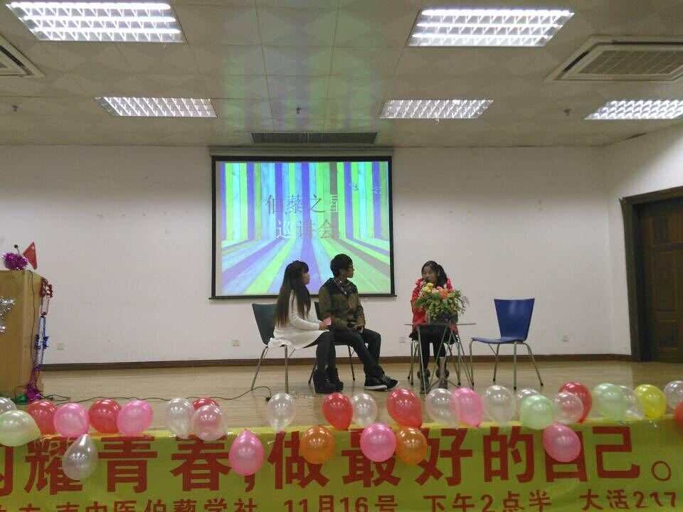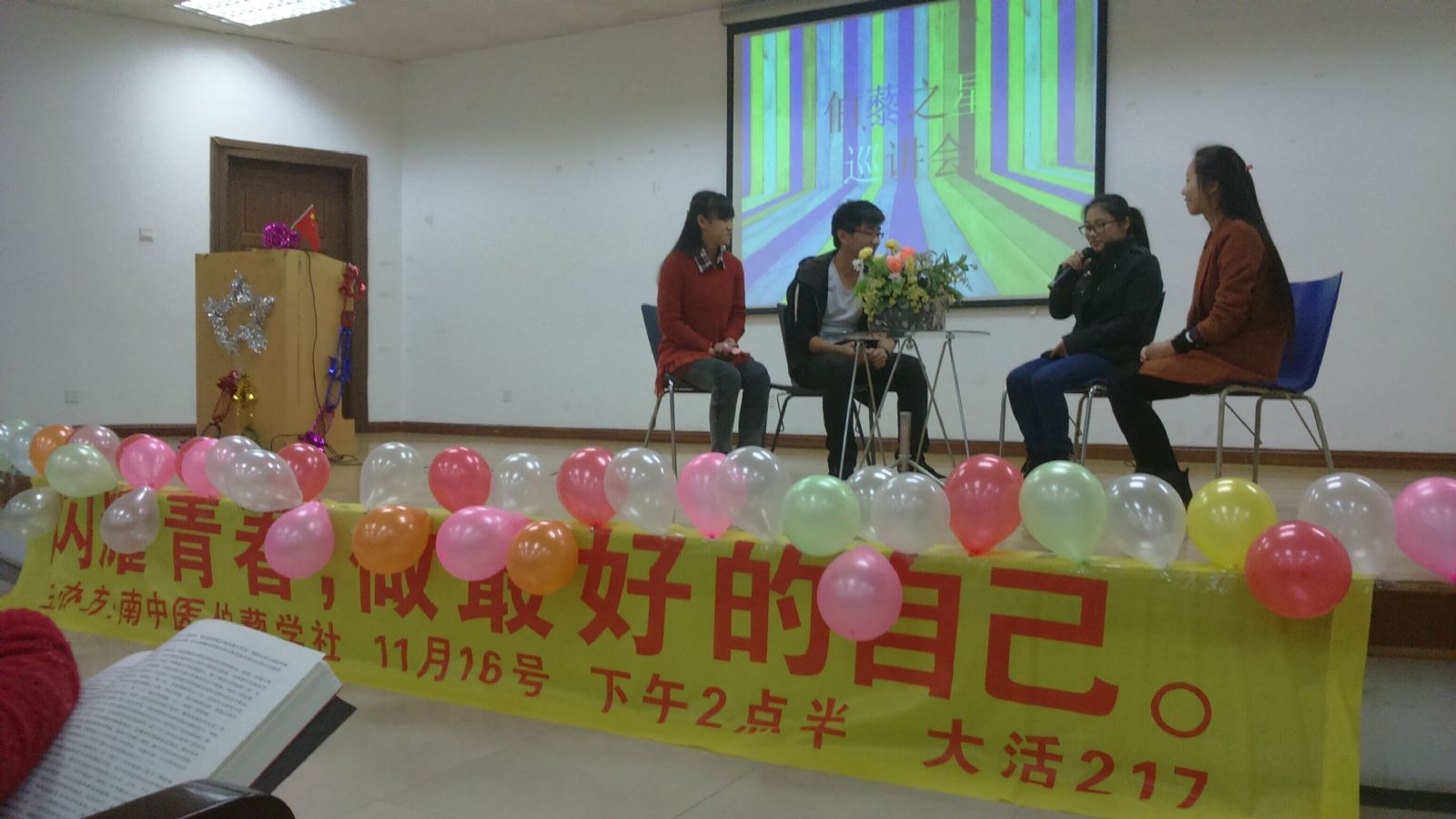 2014年11月16日南京中医药大学伯藜学社在大学生活动中心217召开了伯藜之星巡讲会。下午2时许,大活217就已经济济一堂,南中医伯藜学社的工作人员很早就布置好了宣讲会现场。工作人员也在门口给不断到来的观众分发礼品。