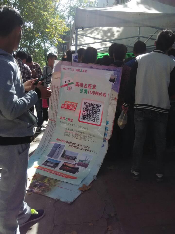 中午时分,有很多同学参与到活动中,纷纷拿出手机进行微信扫描关注南特占座宝。活动第一天能够吸引众多同学的关注,不仅仅是因为海报上最显著的“免费打印照片”六个字,更因为海报中下方占座宝的多功能吸引了南特学子的眼球。“占座宝”是一家以服务在校大学生,切实帮助他们解决生活与学习中的问题为宗旨的互联网公司,致力于打造一个活跃的在校大学生服务与交流的全国性网络平台。且南特占座宝是由江苏陶欣伯助学基金会的创业项目指导老师为鼓励陶学子积极关注校内外最新信息而建立的。这不仅给南特院陶学子带来了优越的信息条件,而且在伯藜学社这个庞大力量的宣传下占座宝给全校师生也带来了广泛的信息资源。占座宝功能齐全,是学生全面又实用的好帮手。它可以帮助学生查课表、查成绩、查空教室、图书馆检索;它还能帮社团和学生会组织活动、开展调查、发言讨论、发布信息;更有二手货调剂、失物招领、特价看电影、快递查询等实用功能;产品一大特点是有三名哈佛校友坐镇占座宝提供创业和留学辅导。多元化的功能为在校大学生提供了更加便捷的学习与生活,深受同学们的喜爱。
