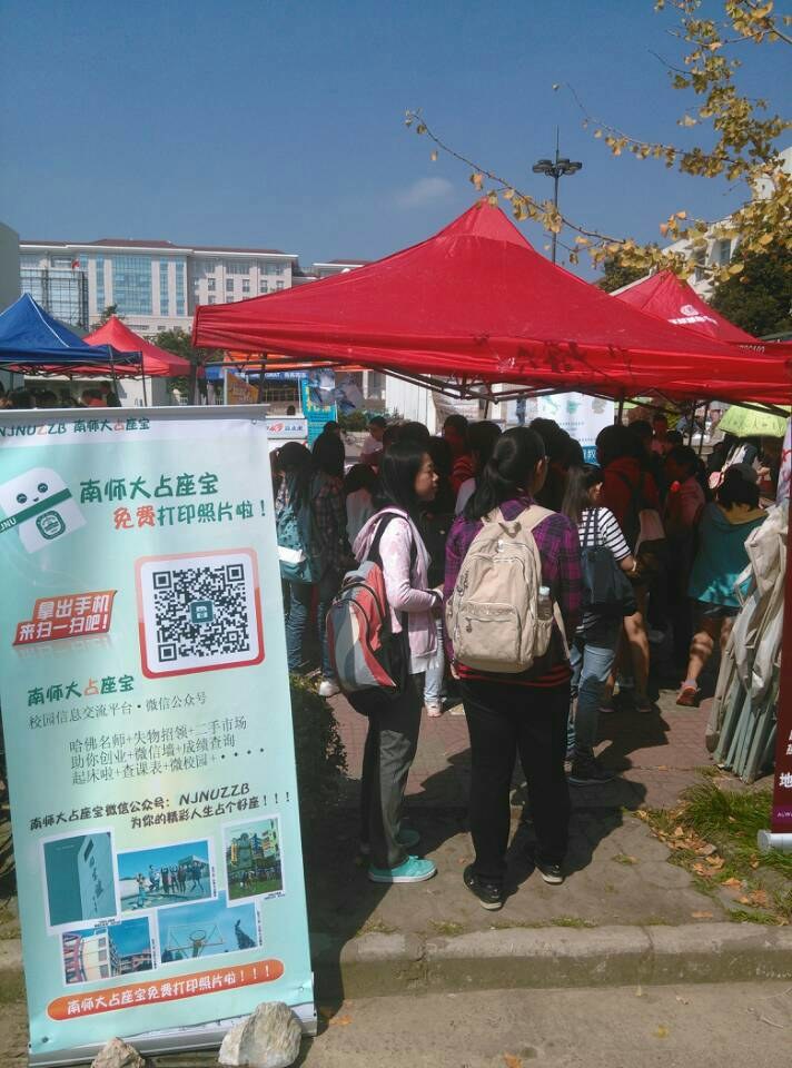 2014年10月10日至12日,南京师范大学伯藜学社联合微信号占座宝开展了扫一扫二维码免费打印照片的“闪印青春”活动。