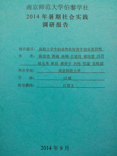 在数据采集和数据整理分析完成的情况下,团队着手共同完成最终目标——一份具有创新性和真实性的调研报告——《大学生创业和农村青年创业差异性调研报告》。本次调研报告共分为10章,对大学生创业和农村青年创业从创业现状、创业模式、创业动机(意愿)、创业环境、团队(企业)本身、创业的优势劣势等方面进行了多角度的、深入的、有创新性的分析和总结。本次报告专业性、热点性、创新性强,结构严谨,获得了学校专业评审团的一致好评。