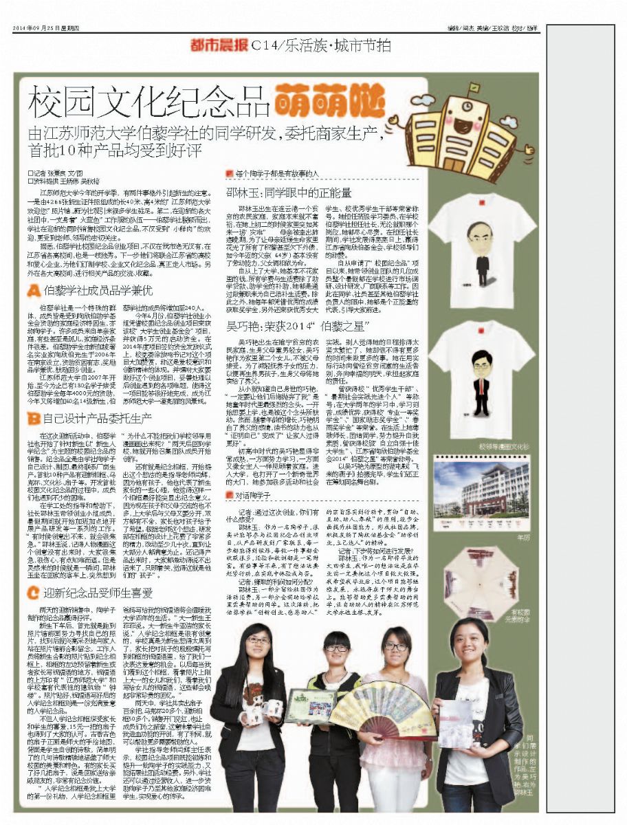 据悉,伯藜学社校园纪念品创业项目,不仅在我市绝无仅有,在江苏省各高校间,也是一枝独秀。下一步他们将联合江苏省的高校和爱心企业,为他们订制学校、企业文化纪念品,真正走入市场。另外在各大高校间,进行相关产品的交流、收藏。