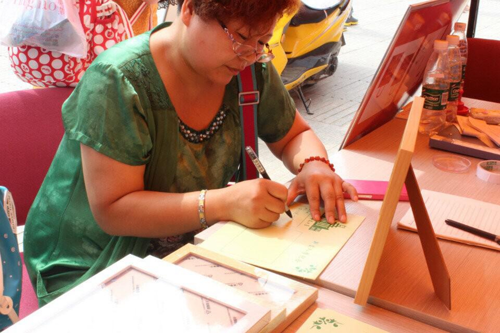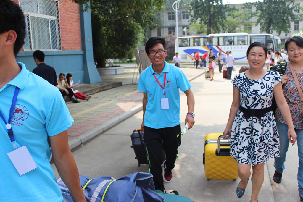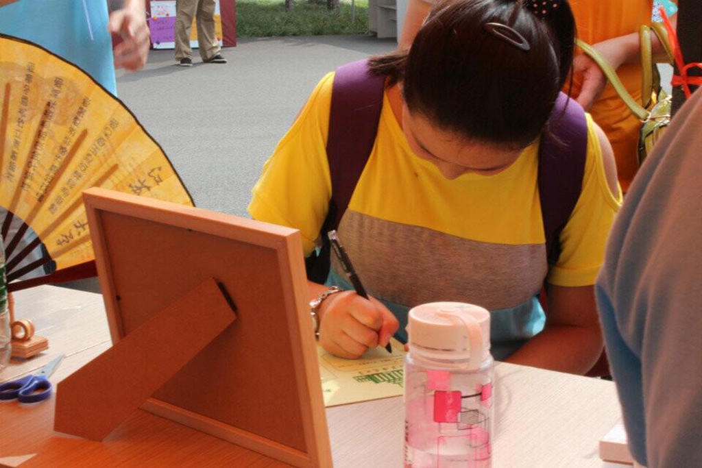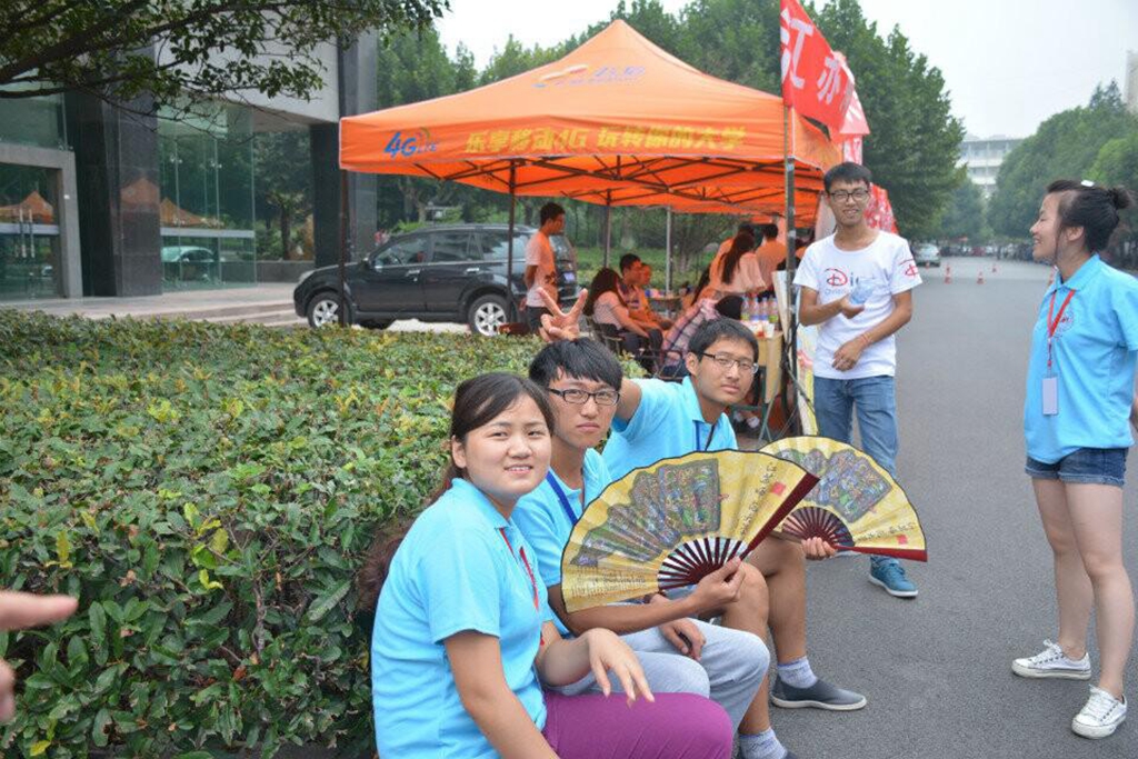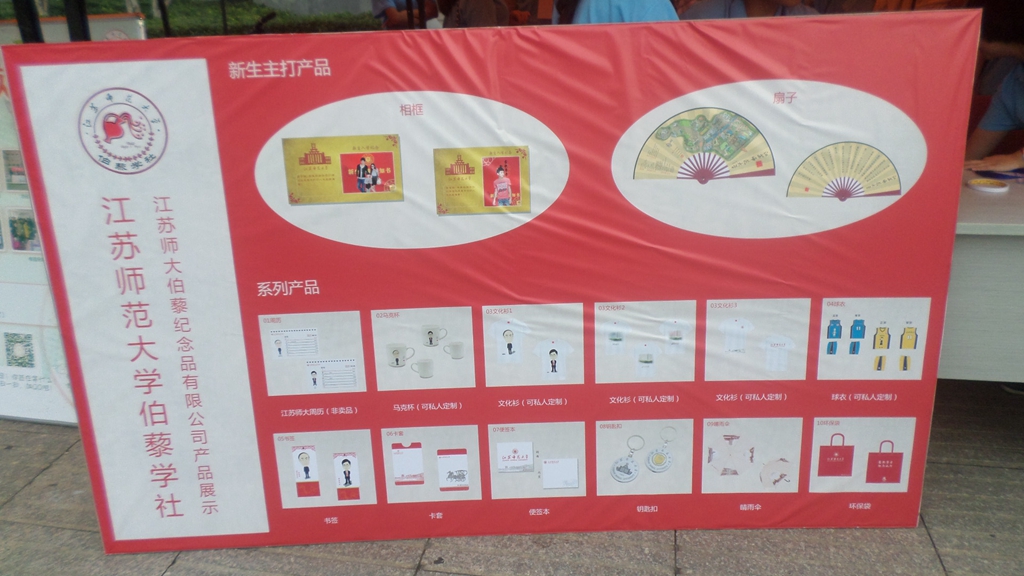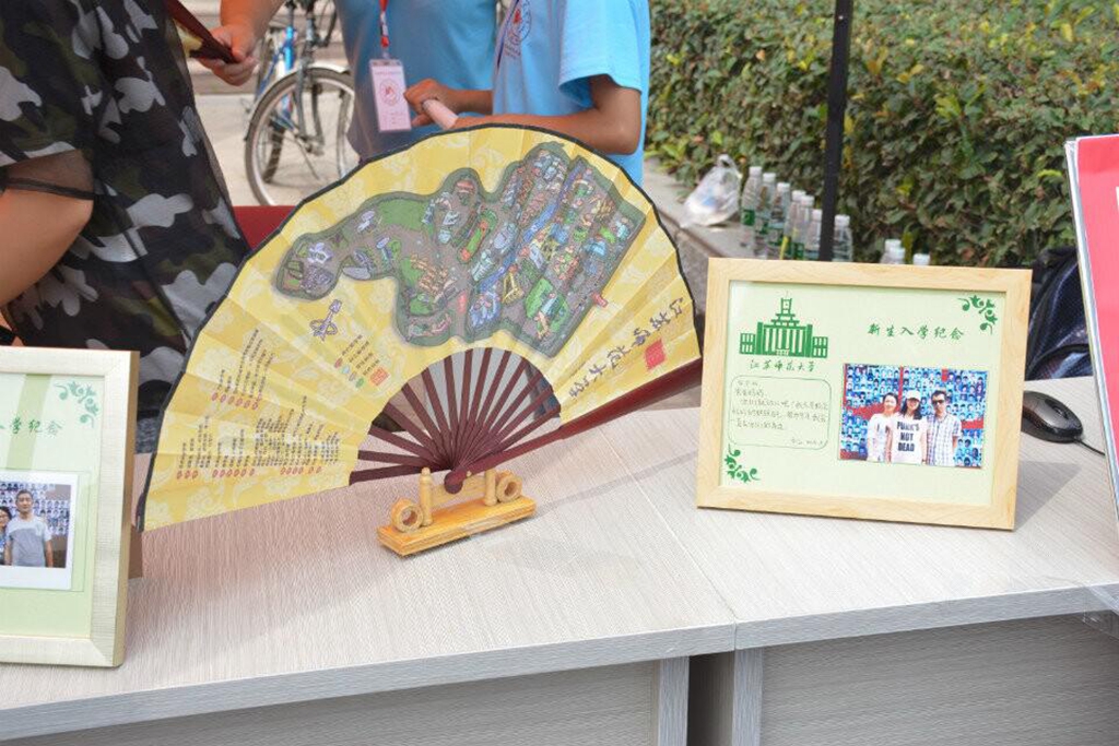 在迎新的这几天,别出心裁的照片墙始终都是人气最高的地方,徐州电视台和徐州日报连续两天都来照片墙前采访我校的新生和家长,找到自己照片的新生高兴地把自己的头像指给电视台的记者看。在21世纪大楼旁边的迎新通道,一辆接着一辆的校车载着满心欢喜的新生接踵而至。新生下车后,首先就是跑到照片墙前面努力寻找自己的照片,找到后就兴高采烈地与家人站在照片墙前合影留念,工作人员负责将新生合影的照片贴到特制相框的右边,相框的左边预留着新生或者家长写祝福语的地方,祝福语的上方印有“江苏师范大学”和学校富有代表性的建筑物“钟楼”。照片贴好,祝福语写好后的入学纪念相框则是一份充满爱意的入学纪念品。这就是伯藜学社研发的校园文化纪念品中的新生主打产品之一:入学纪念相框。不但入学纪念相框深受家长和学生的喜爱,伯藜学社设计的扇子也得到了大家的认可。古香古色的扇子正面是师大的手绘地图,反面是一首本校学生自创的诗歌,简单明了的几句诗歌却精确地涵盖了师大校园的美景和特色。有的家长买了好几把扇子,说是回家送给亲戚朋友的,既美观又有纪念价值。