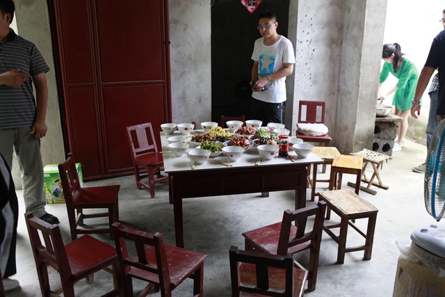 巧艳和同学们去地里把蒜苗挖回家后,做菜的素材也准备齐全了,为了不给巧艳家添麻烦,同学们都自带干粮,提前一天到达的同学已经买好了馒头和部分蔬菜等食材。在狭长的小院子里呈现出一幅热闹的农家生活图,有的同学洗菜,有的同学削土豆,有的同学剥蒜苗,有的同学在切菜……巧艳则在厨房里开始生火了,从小就开始学做饭的巧艳,经过十几年的历练,现在已经拥有了非常优秀的厨艺。第一道菜是炒土豆丝,第二道菜是炒鸡肉,到三道菜是青椒炒鸡蛋……负责端菜的同学看着香喷喷的菜肴,忍不住想先吃上几口。看着“大厨”巧艳敏捷的身手、娴熟的炒菜动作,令在场的同龄人都自愧不如,巧艳一边做菜一边和老师、同学们切磋做菜的技巧。村子里的环境十分优雅,巧艳家门前的小路两旁,载着两排翠绿笔直的白杨树,郁郁葱葱的白杨树下,绿荫浓浓,凉风阵阵,真是一个避暑的好去处,于是同学们就把桌子搬到巧艳家的大门口,准备在树荫底下进餐。