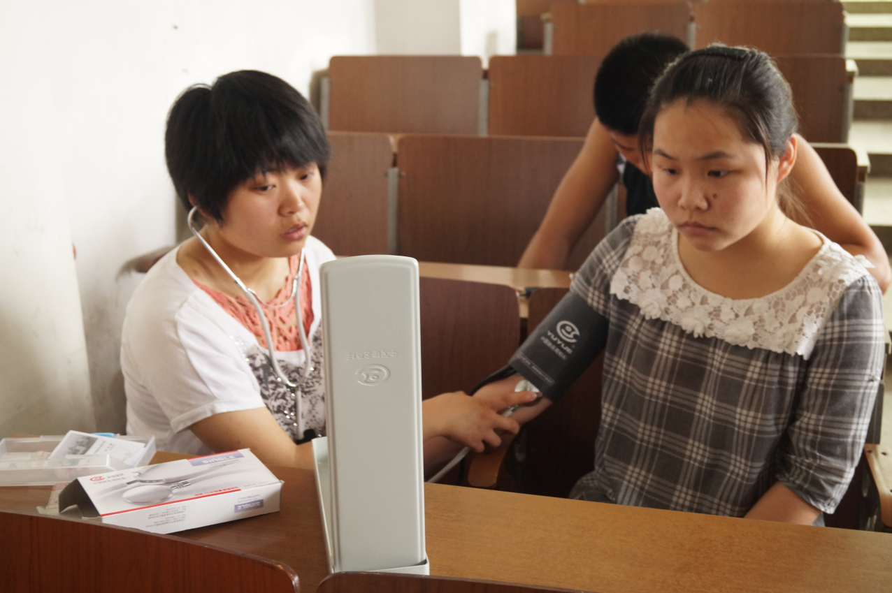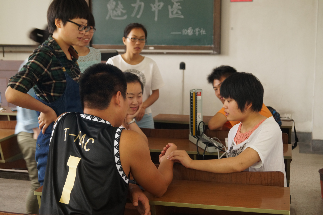 讲解结束后,孙何蕾同学拿出了自己的血压测量仪,给同学们做血压测量。“好害怕自己有高学压啊!”来自新闻与传媒学院的陈霞同学在测量血压是激动地说着。孙何蕾的周围围着前来“看病”的同学们,她耐心地给每个同学做着检查,同学们的眼神都聚到了她的身上。“我帮你把把脉吧!”“血压心跳都很正常……”“可以吃点补脾的食物……”她细心地测着血压,把着脉并给同学们提着建议。“她真的很像一个老中医,‘望闻问切’,她真的做到了。”扬州大学伯藜学社文汇路分社社长陈一轩赞叹道。