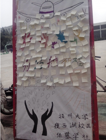 “用一句句真心的话语,为‘马航’祈福。”3月20日,“马航”失联的是第13天,扬州大学伯藜学社瘦西湖校区分社的学生们在江苏省教育超市对面举行“为‘马航 ’祈福”活动。