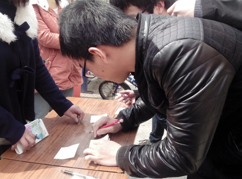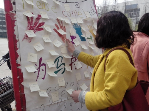 “放飞心愿,让我们共同为‘马航’祈福,希望他们一切安好。”中午11点30分,伯藜学社的同学们便行动起来了,他们搬来了桌子,竖起了展板,每个人都在了卡片上写下了祝福语并贴在了展板上。随后,过往的同学们也停住了脚步,在卡片上写下一句句对“马航”美好的祝愿。“希望你们早日归来,我们都在等你们”,这是学生徐蕾的话语。“我相信你们会平安回来的,加油!”,“‘马航’快回家吧!”,“希望只是虚惊一场,梦醒一切依旧温暖,早日回来!”……祈福的牌子上留下了同学们满满的祝愿。“伯藜学社的同学们用他们的行动呼吁人们关注‘马航’,祈福‘马航’,我相信‘马航’会好好回来的。”来自教育与科学学院的张钰洁同学写下自己的祈福语后表示说。