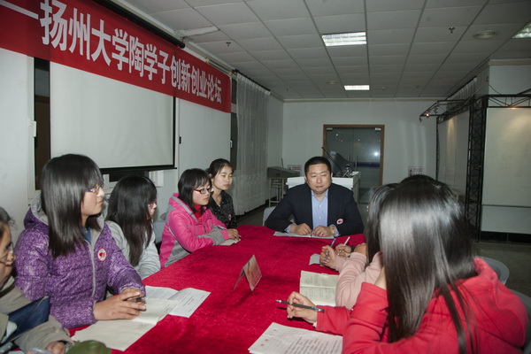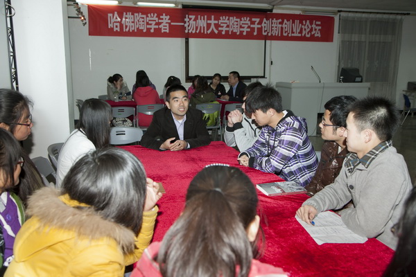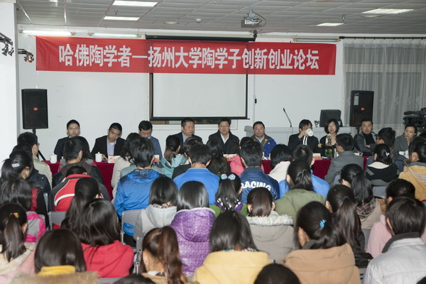 2013年4月20日,扬州大学美丽的瘦西湖校区迎来了哈佛商学院2001届秦志勇、2003届林利军、2005届魏可、2007届胡蓉蓉和方骅、2008届白霄冰、2010届张学午和徐昕等8位陶学者。江苏陶欣伯助学基金会首次举办的陶学者—陶学子创新创业论坛在扬州大学成功举行,扬州大学100名陶学子参加了此次论坛。