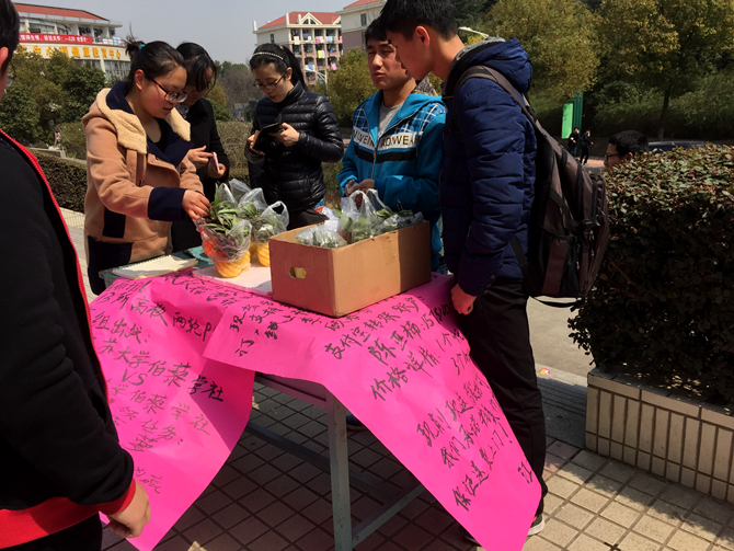作为首轮擂主,在由基金会老师抽定营销商品种类和地点后,江苏大学伯藜学社迅速组队讨论,同时展开了周密的策划和精细的分工。本次活动采取单一精准的销售模式,并且决定只销售菠萝这一种成本低、销路好的快销产品。还针对菠萝水果的特殊性,采取大胆操作模式–将“削皮”环节外包出去,从而减轻负担,腾出手来专注销售。此外,学社销售团队迅速制定适宜销售的策略:线上结合线下,在现场贩售的同时接受电话、短信、QQ等新媒体工具的预约,支持支付宝转账、货到付款等一系列方便可行的手段,保证销售环节的连续和流畅。另一方面,学社宣传部利用所有新媒体工具充分进行活动前期的宣传和推广,积极调动学社各部人员的积极性,确保活动人数的充足。