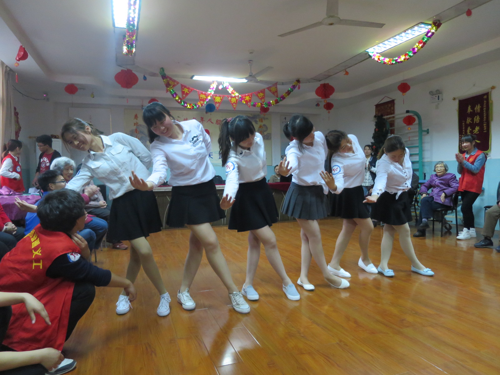 中午12:20,陶学子们准时在北门集合出发。一个小时的车程将陶学子们带到了爷爷奶奶们的身边,暖阳渲染的天空下,陶学子们热情洋溢地陪爷爷奶奶聊着天。短暂的安排后,精彩的演出正式开始,那是一曲小合唱,铿锵有力的歌声响彻大厅,《精忠报国》那激昂的曲调很快就带动了现场气氛。紧接着是舞蹈《燃烧吧!蔬菜》,炫酷的旋律更是让现场的气氛越来越欢快,陶学子们的热情很快感染了现场的老人和工作人员。到了《音乐照顾》的环节,陶学子们邀请了爷爷奶奶一起互动,在陶学子耐心的示范带领下,老人们很快就进入了状态,和陶学子们开心地舞动起来。来自藏族漂亮姑娘巴桑普赤为老人们带来了民族舞,邢前帅同学送上了欢快而激情的《最炫民族风》,现场的气氛几度达到高潮,几位护工姐姐也加入进来伴舞。在轻松愉快的气氛感染下,几位爷爷奶奶主动献唱经典老歌《东方红》、《小芳》、《歌唱二小放牛郎》,嘹亮的歌声再现了爷爷奶奶们年轻时不逊于我们的青春与活力。最后,陶学子们献上了他们的压轴节目《玉生烟》,柔美的舞姿伴着动人的音乐,让人如临仙境。