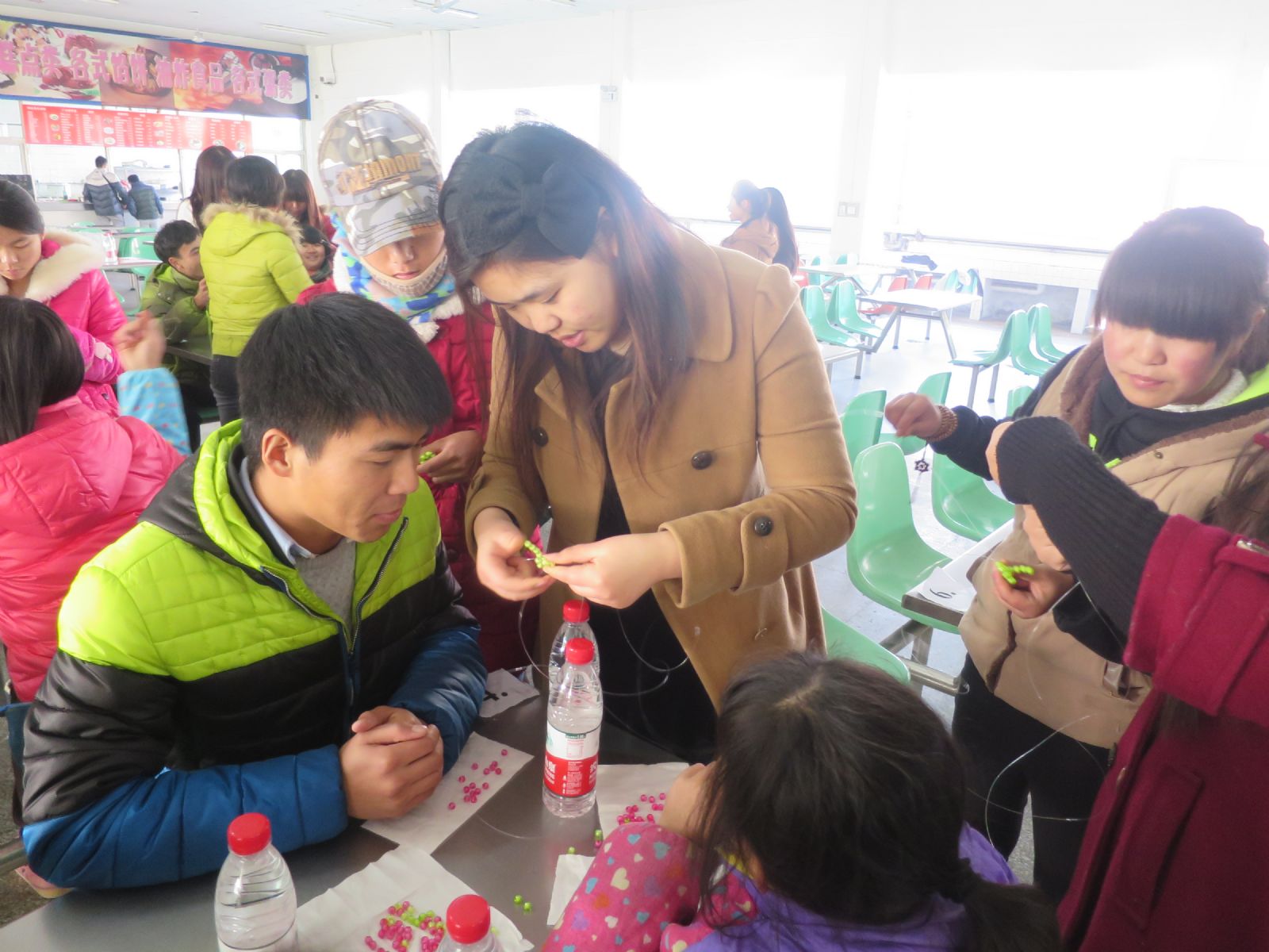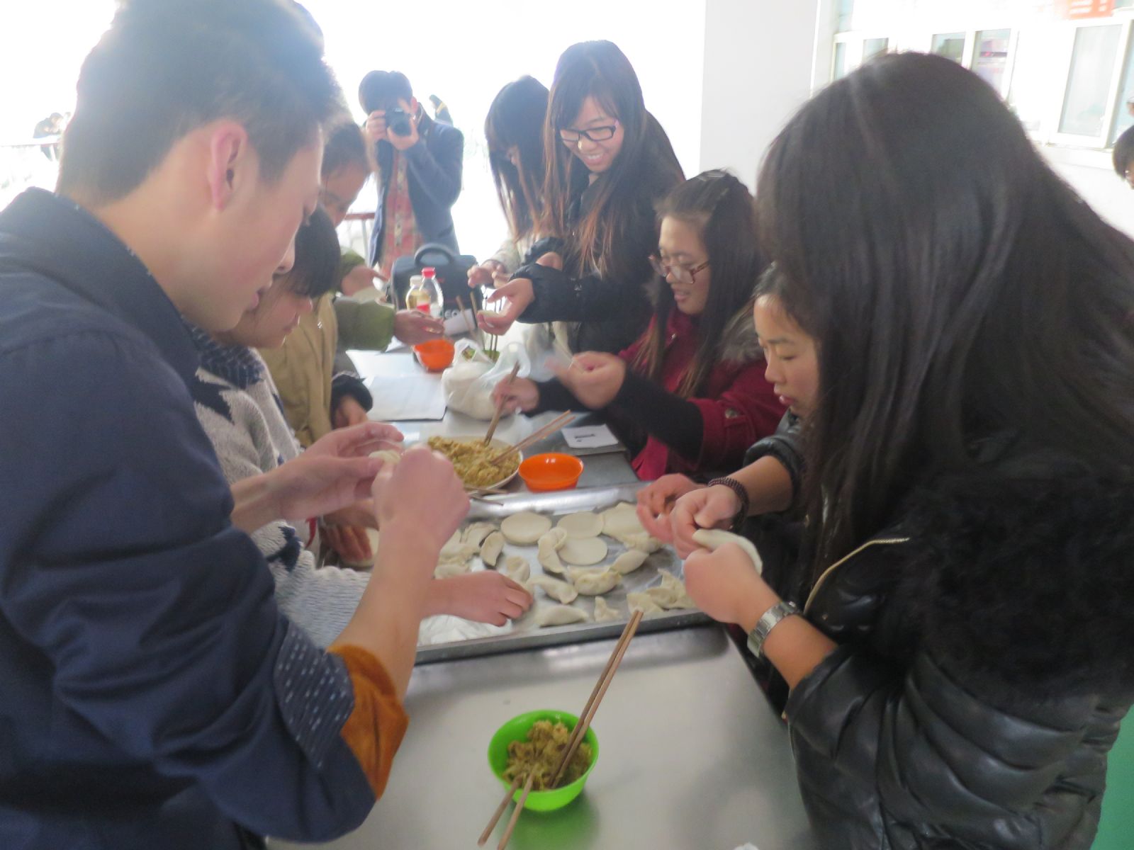 首先,我们根据自己的号码寻找组员,第一个热身运动是串珠,是由南特陶学子教我们做。起先,我们手忙脚乱,但是在他们的认真帮助下,我们很快的掌握了做串珠的方法。在活动中有的人露出了灿烂的微笑,因为他们串的草莓晶莹剔透,而有的人则抓耳挠塞。紧接着,包饺子时间到了,东道主们把饺子皮,馅准备的相当齐全。我们根据自己所在的组,有的组员从不会包到渐渐学会的过程看得很用心,而有的人包饺子有模有样,形态各异,在大家的齐心协力下,完成了此次比赛。第一组以数量最多摘得桂冠,第二组荣获“最美饺子”称号。整个食堂的气氛变得更加欢快。