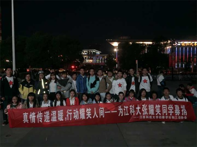 2015年10月31日,江苏科技大学伯藜学社,三自协会携手各个学院义工站于镇江市万达广场、大市口东侧开展为江苏科技大学14级在读研究生张耀笑的公益募捐活动,此次活动共筹得善款17486.8元。