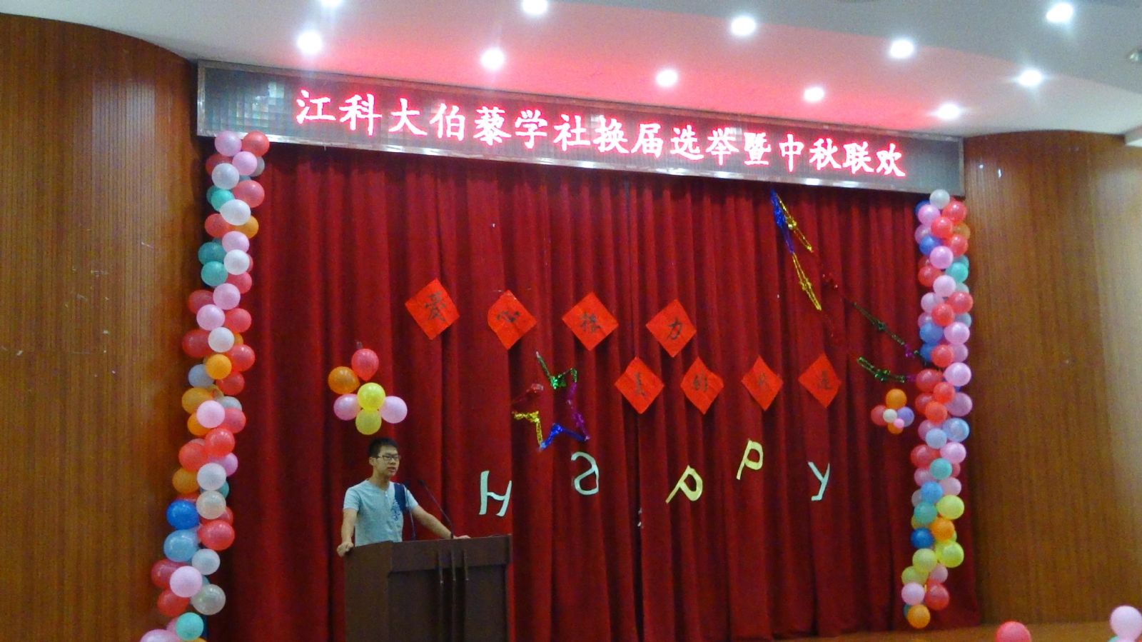 2014年9月8日晚,江苏科技大学伯藜学社全体陶学子相聚于西校区学术报告厅举行了换届选举暨中秋联欢活动,在精心布置的会场里,大家不仅见证了一场正式的换届选举,而且拥有了一个美妙的中秋之夜。